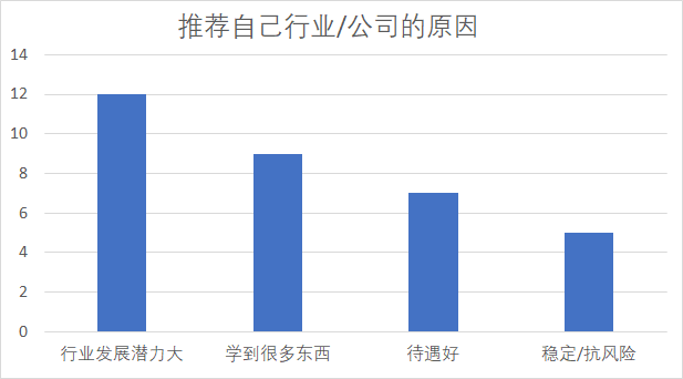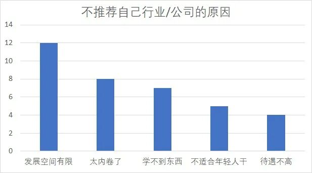 最后看看受访者不推荐应届生加入自己行业/公司的原因。毫无悬念,最重要的原因是“行业发展空间有限”;其次是“太内卷了/掐尖效应明显”;再次是“学不到东西”。在金融业,很多人表示“这一行不适合年轻人干”,应该在实体行业积累一些经验和资源再说。“待遇不高”则相对不太重要——或许是因为大家的待遇都不太低,或许是他们认为跳槽了也不会拿到更高的待遇。