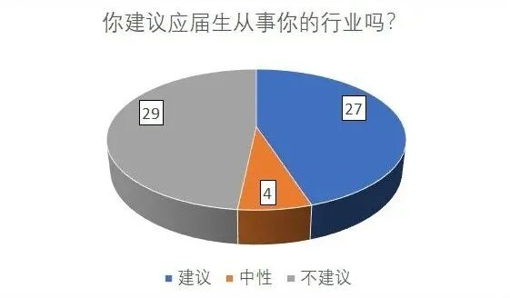 令人惊讶的是,在这个“劝退”成风的时代,在60位受访者中,竟然仍有27人(约占45%)建议应届生加入自己的行业;有4人(约占7%)持中性态度;29人(约占48%)不建议加入自己的行业。这也出乎我的意料——在调查开始前,我还以为至少会有三分之二的人不建议加入自己的行业。看样子,大家的悲观程度可能没有想象中那么高。