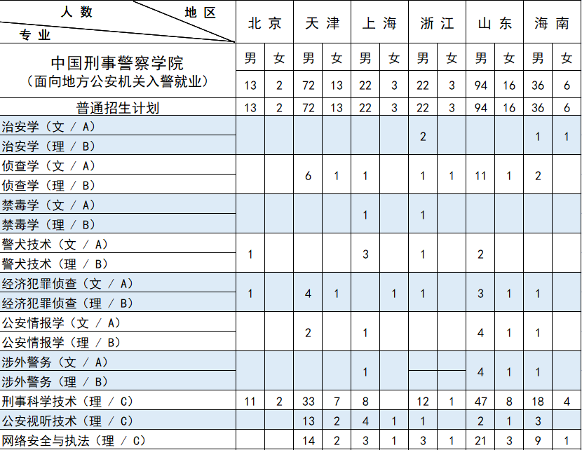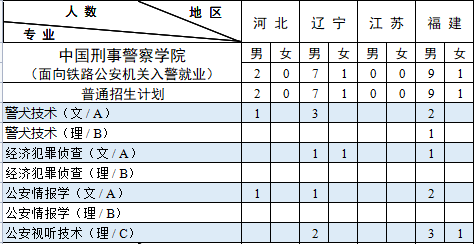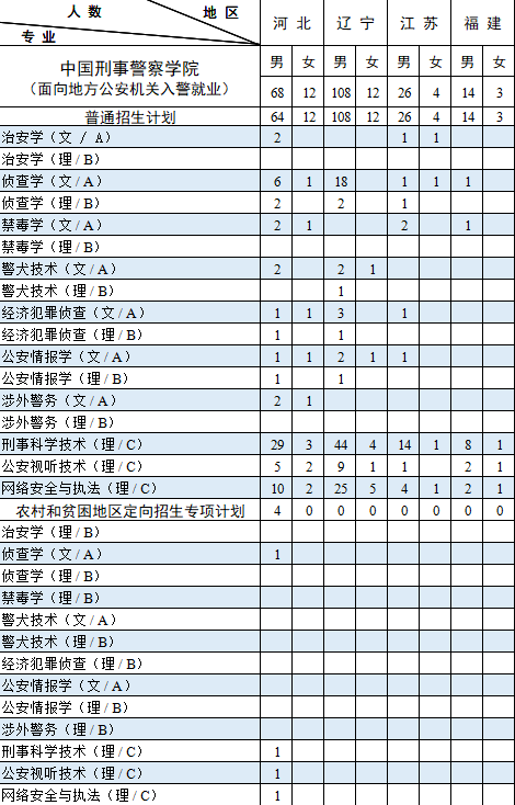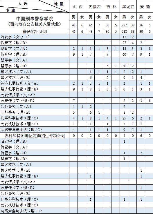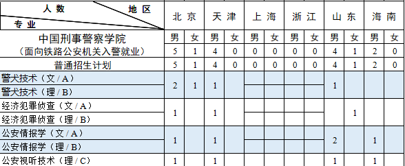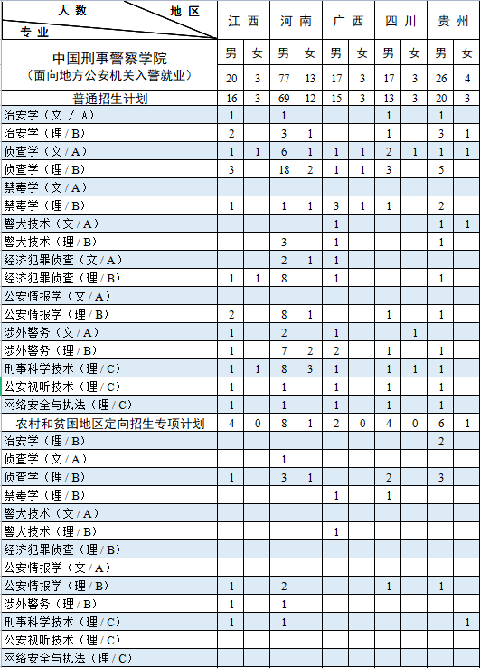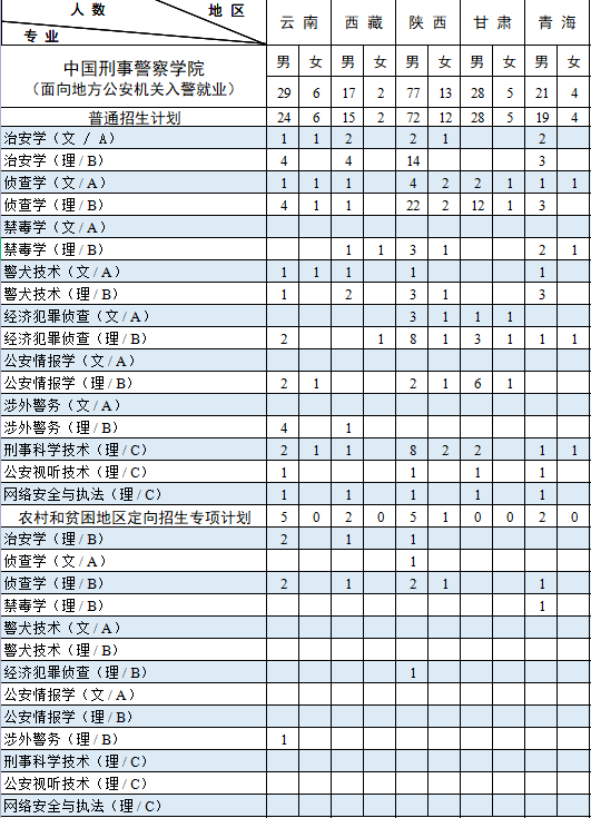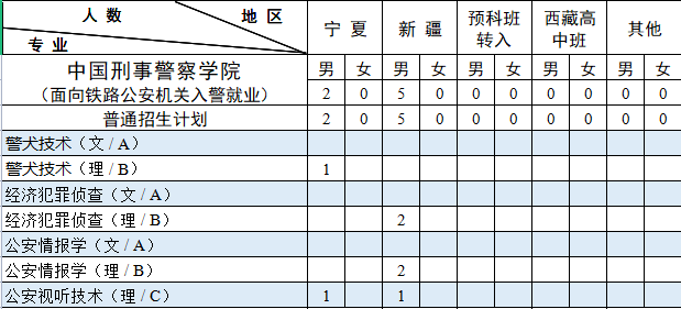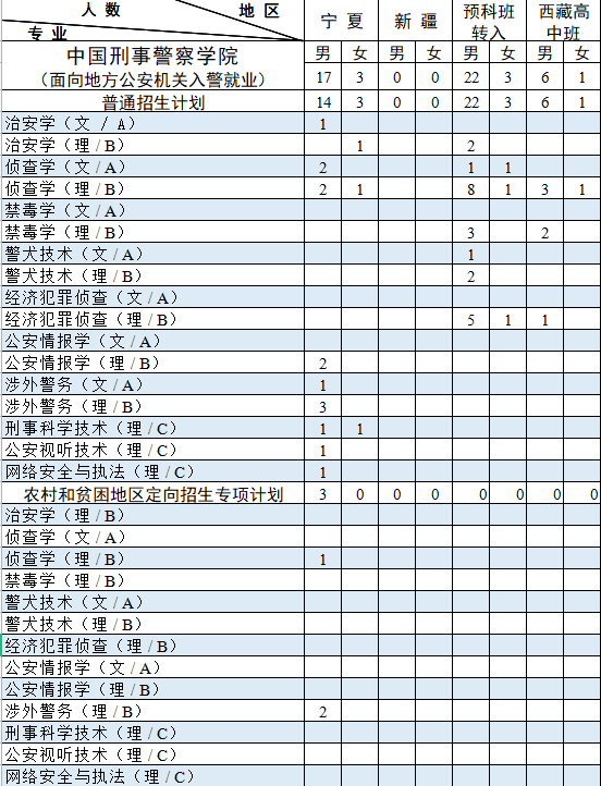 西藏计划中含内地西藏班计划 7人。其中:男生 6人,即侦查学(理)3 人,禁毒学(理)2人,经济犯罪侦查(理)1人;女生 1 人,即侦查学(理)1 人。