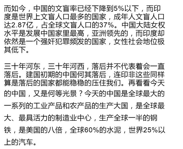 我们顶住压力,用买武器的钱发展教育,不仅将文盲率降到了5%以下,而且培养了大批各个领域的专业人才,为崛起打下了坚实的基础。印度当时买买买把中国甩出老远,但中国证明,教育才是当时发展国家最有力的“武器”,没有人才就没有今天的国产航母和歼20,反观印度自己啥也造不出来,钱却仍越多,国家越来愈穷。