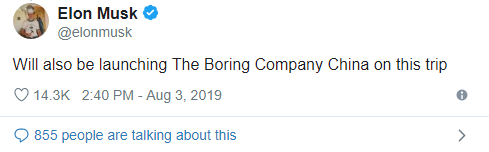 2019年8月,马斯克发推称:将会在世界人工智能大会中国之行,启动Boring Company的中国项目。