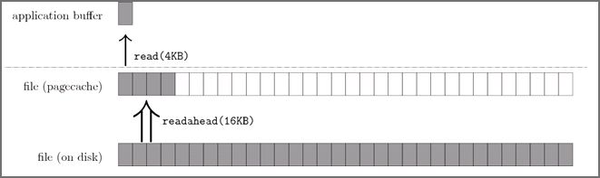 上图中,应用程序利用 read 系统调动读取 4KB 数据,实际上内核使用 readahead 机制完成了 16KB 数据的读取。