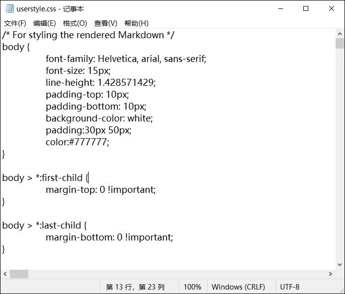 然后,Joplin会自动打开一个文本文档,这时,把之前在百度网盘下载到的“Pomonote.css”文件的内容全部复制粘贴进去,如下图: