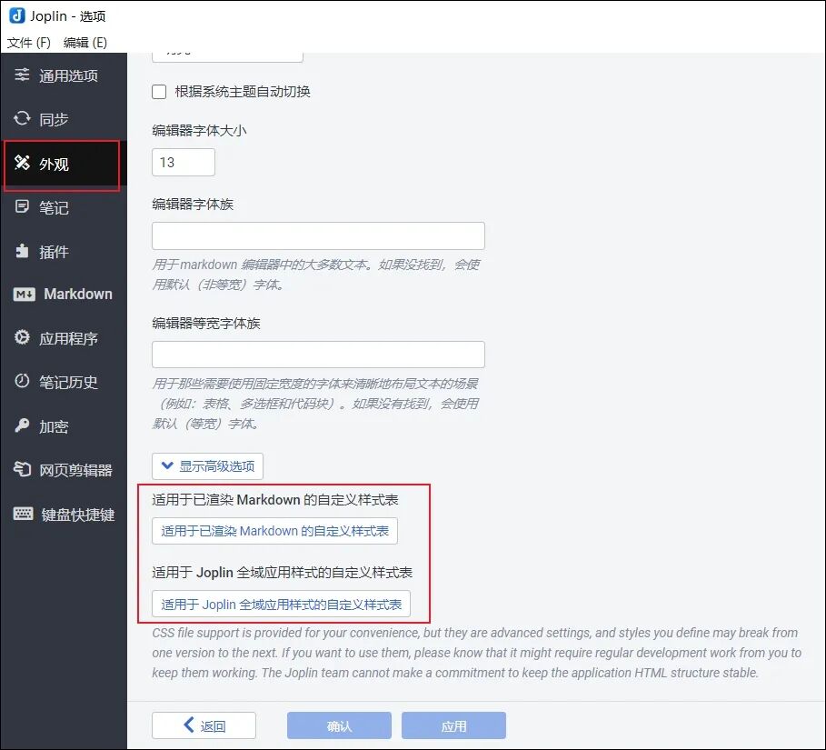 在设置界面中,切换到“外观”选项卡,在这里,你可以设置Joplin界面的主题、编辑器字体及字体大小等等,也能设置Markdown语法的样式。