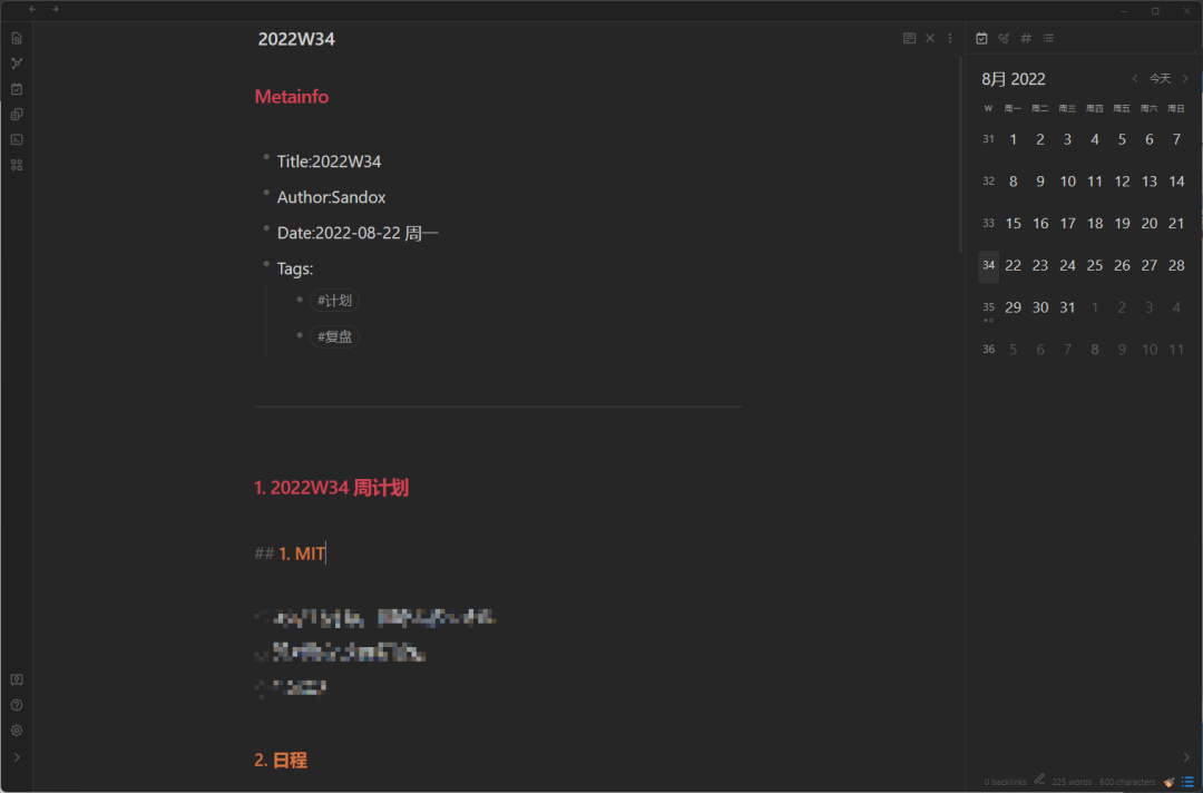 计划和复盘,现在我也放到了Obsidian中,因为以下两点原因: