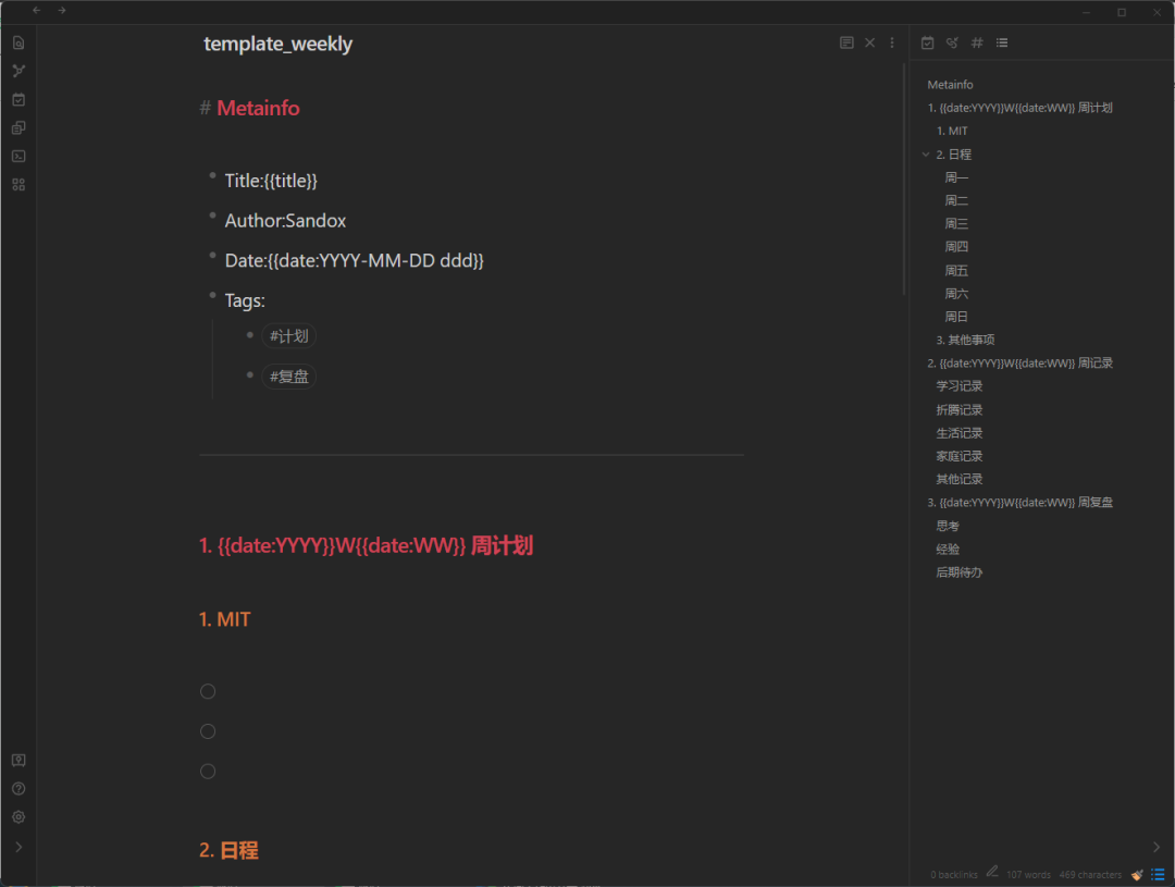其次,在Obsidian中,事先制定一个计划模板,套用起来非常方便。