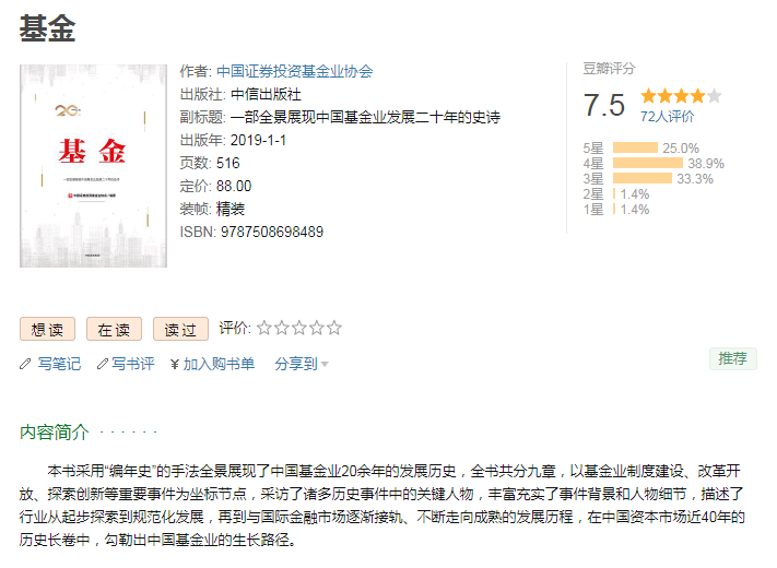 《基金》是中国证券投资基金业协会编著的书,2019年1月由中信出版社出版。本书在豆瓣的评分是7.5分,在微信读书APP上的推荐值是71%,微信读书APP上可以免费阅读此书。