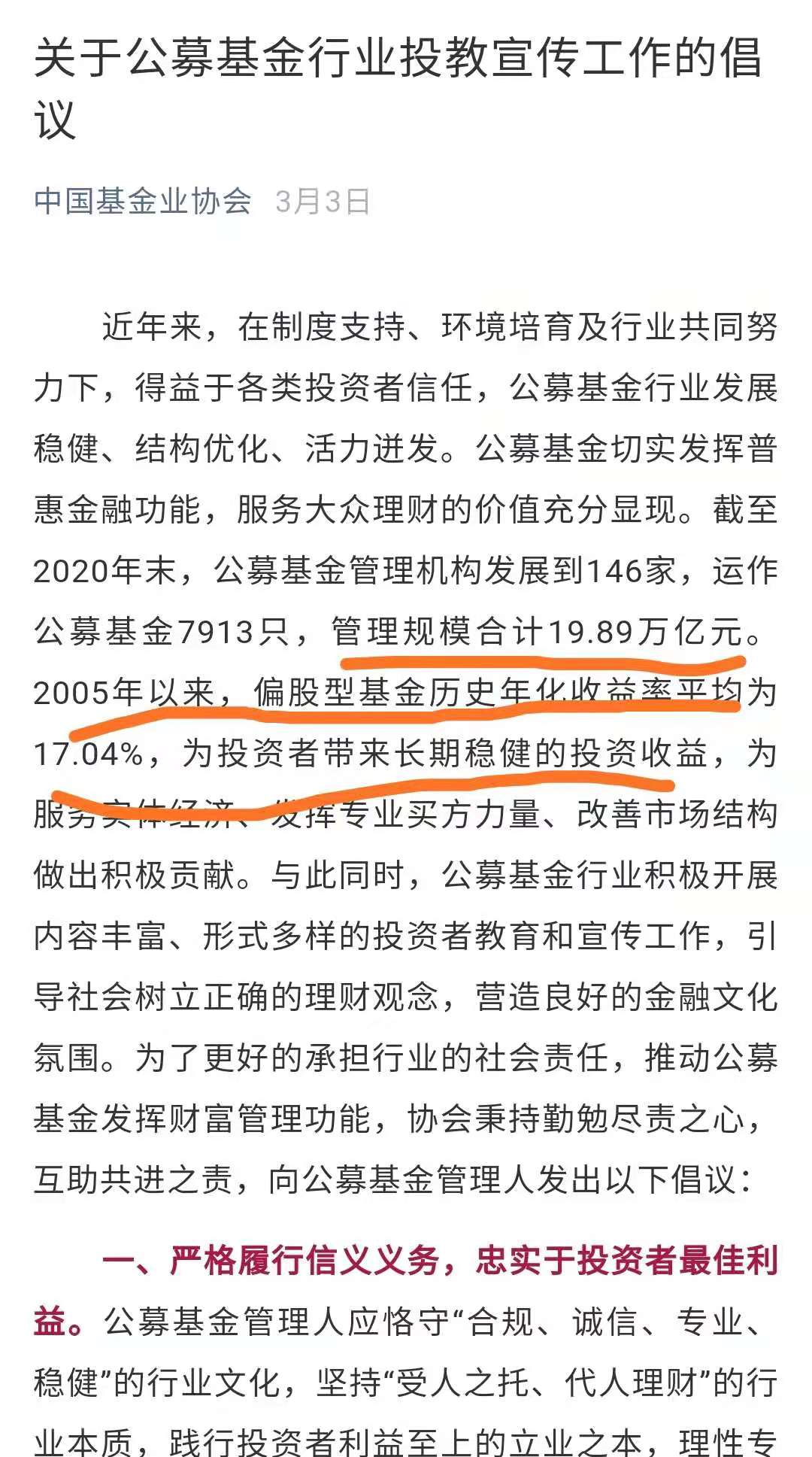 对世界充满好奇,对新事物喜闻乐见,不以偏见来看待老事物,承认自己的认知局限,学会多多倾听。回到21世纪初,基金是全新的事物,我们是否愿意通过学习来认识?每逢基金有了创新品种,我们愿不愿意进行了解?有好奇心驱动,我们才会更加积极,我们会在主动探索中收获自己的乐趣并成为领先者。A股市场早期充斥着“博消息”、“坐庄”等投机行为,市场对证券定价的有效性低,市场的波动幅度极大,我们当前可曾看到A股市场的进步与变化?树立长期投资的信念,坚持做长期能保证正确的事情。在书中所统计的时段里,20年来,公募偏股型基金的年化平均收益率为16.5%,对应下来的涨幅是20年约20倍。诚然,这个数据可能因为涵盖了06-07年这样的大牛市而偏高,即便我们将上述数值降低,20年能够取得的投资回报也是惊人的。待在市场中要承受风险,但一直待着能保证β收益,下跌没躲过的投资者因为一直待着,同样也不会错过上涨的时候。长期来看,公募基金整体是创造价值的,我们不应该因为一时的投资回报不如意就沮丧或信念动摇。公募基金倡导的受托责任精神,提倡科学投资、理性投资和价值投资。并非所有的基金管理人都能做好,但一个精神三种投资对个人投资者来说也很有意义,理解其内涵有助于让我们变成一个更好的人。科学投资,我们如何学习来打造自己的投资体系,掌握基础的投研方法?理性投资,我们如何约束好自己的投资情绪,如何与市场先生平和相处?价值投资,我们如何理解价值,如何追求价值人生?这些问题都是值得我们去思索与探索的。