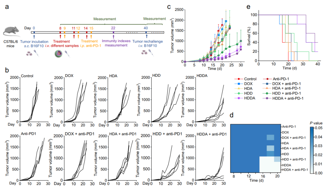 进一步研究发现,HDDT NBs在系统给药后,可在肿瘤区域积累,抑制不同肿瘤模型下的肿瘤生长,大规模诱导免疫原性细胞死亡,并在原位产生HMVs,将肿瘤组织转化为抗原库,单独或联合免疫检查点阻断疗法,能够诱导肿瘤内和全身免疫反应,建立强大的免疫记忆效应,治愈小鼠肿瘤,且有效保护不再复发。