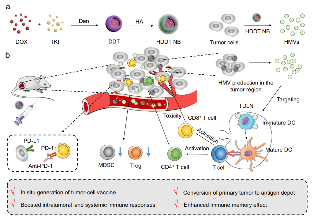 总的来说,该研究开发的HDDT诱导的微米尺寸的囊泡(HMVs),为原位生产自体肿瘤细胞疫苗提供了一个简单而有前途的基于纳米技术的策略,并可能为个性化癌症疫苗的开发提供线索。
