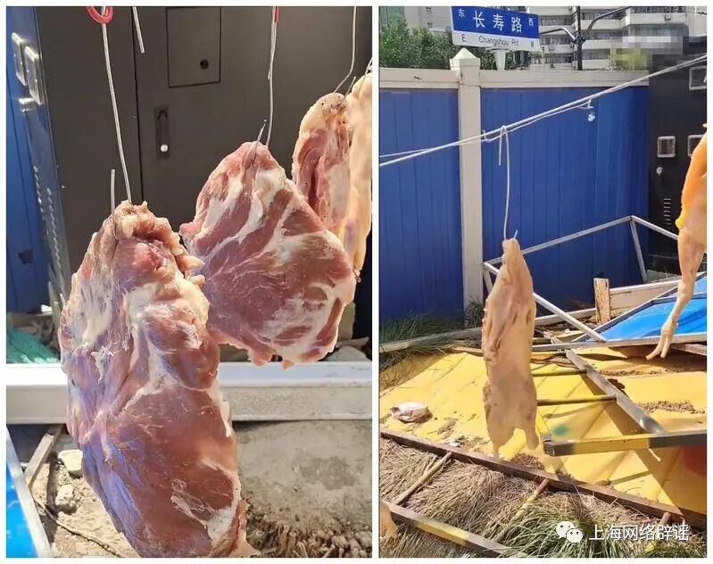 近日,网络上流传的一段标称出自“水电工张师傅”的视频显示,有人在长寿路常德路路口一带的湿垃圾桶内捡到四五百斤肉,带回附近的工地后晾晒,准备食用。