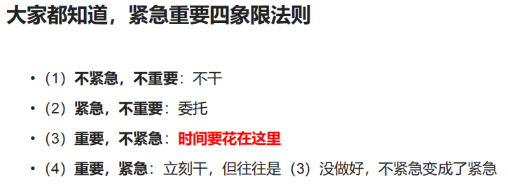 首先我们应该把时间花在重要的事情上,可能很多人说我有很多非常紧急的事情。如果你说有很多非常紧急的事情,这大概率是不紧急的事情,由于你不合理的规划和安排,它由不紧急变成了紧急,导致你每天都在“救火”。