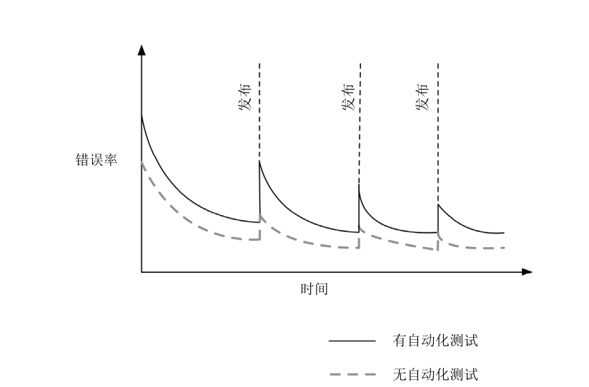 图8-1: 在有/无自动化测试的情况下错误率随时间变化的曲线