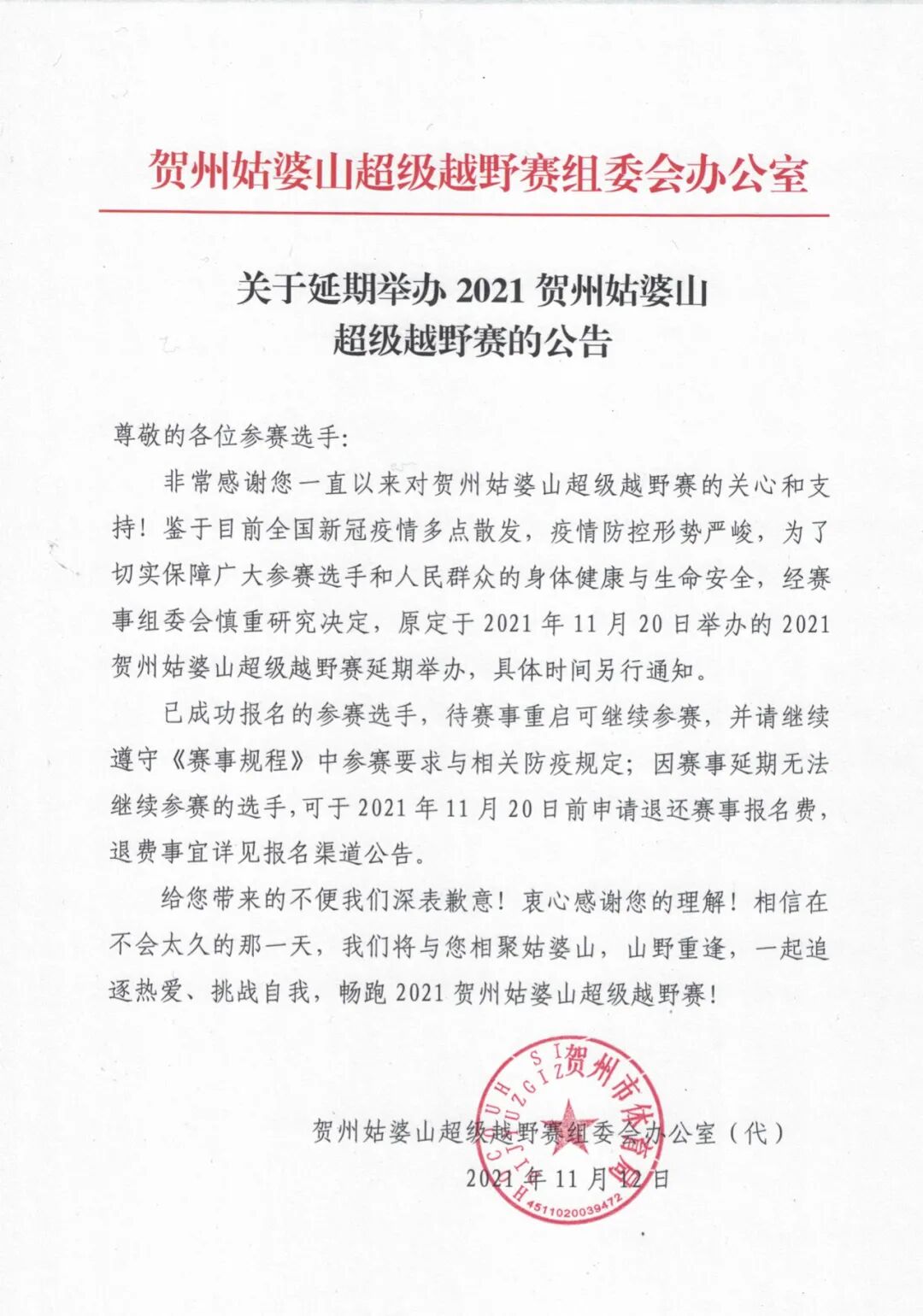 由于赛事延期而无法参与赛事的选手,组委会将为您全额退还报名费,退费政策如下: