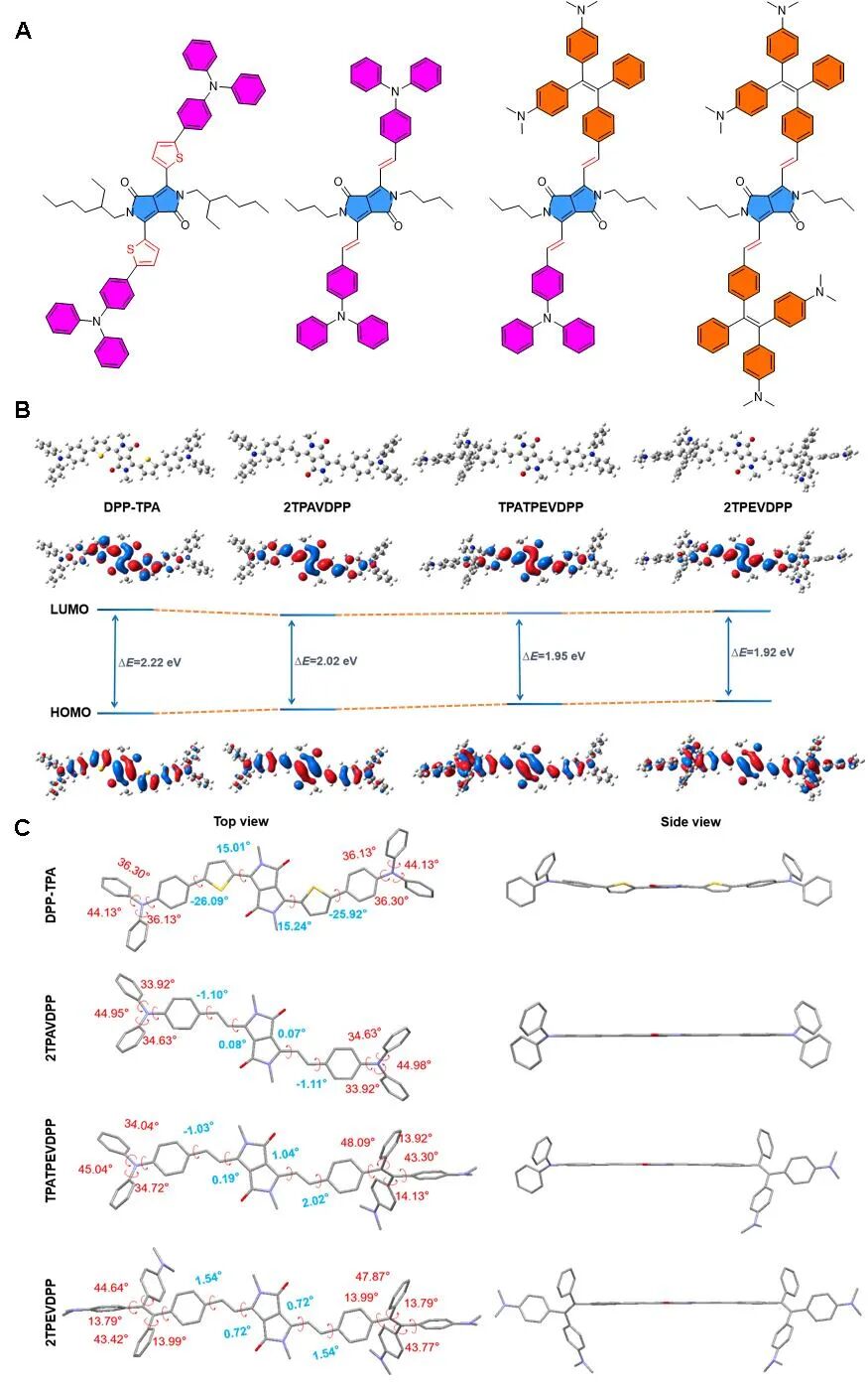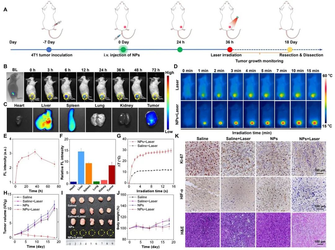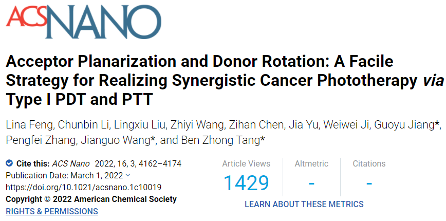 图4.(A)活体肿瘤诊疗时间表示意图;(B)小鼠静脉注射2TPEVDPP纳米颗粒后的体内荧光成像图;(C)2TPEVDPP NPs静脉注射 72 h后的活体组织和肿瘤NIR-I成像图;(D)静脉注射2TPEVDPP纳米颗粒或生理盐水36 h后,在0.5 W cm−2 (660 nm)的激光照射下, 4T1荷瘤小鼠的热成像图;(E)静脉注射2TPEVDPP纳米颗粒后,小鼠肿瘤区域荧光强度随时间的变化图;(F)注射后72 h后肿瘤和主要器官的平均荧光强度;(G)激光照射0- 15 min肿瘤平均温度变化;(H)治疗期间肿瘤体积变化;(I)不同治疗组处理后的离体肿瘤照片;(J)小鼠体重变化;(K)不同治疗组处理后小鼠肿瘤Ki-67、HIF-α、H&E染色。本文第一作者为内蒙古大学化学化工学院在读博士生冯丽娜、李纯斌、硕士生刘玲秀同学,通讯作者为内蒙古大学姜国玉副教授、王建国教授以及香港中文大学(深圳)唐本忠院士。论文链接Acceptor Planarization and Donor Rotation: A Facile Strategy for Realizing Synergistic Cancer Phototherapy via Type I PDT and PTTLina Feng, Chunbin Li, Lingxiu Liu, Zhiyi Wang, Zihan Chen, Jia Yu, Weiwei Ji, Guoyu Jiang*, Pengfei Zhang, Jianguo Wang*, and Ben Zhong Tang*ACS Nano, 2022, 16, 3, 4162–4174