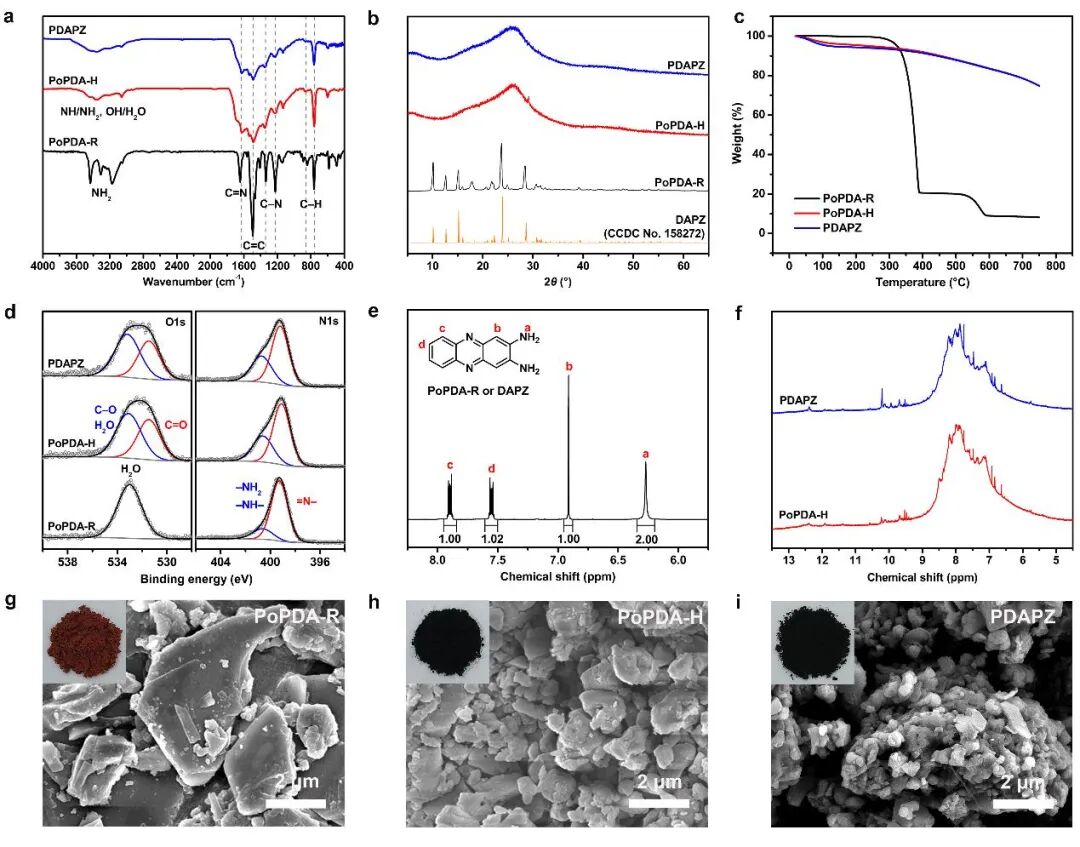 如图1所示,PoPDA最理想的结构是由交替分布的苯环与吡嗪环所构成的完美梯形共轭聚合物PoPDA-I,其理论比容量高达525 mAh g–1(基于吡嗪单元的两电子反应)。然而,由于这种大共轭刚性分子链的生长受到溶解度的限制(尤其在温和反应条件下),目前并没有可靠的证据证明其(及其还原形式)已被成功合成。作者在综合已报道的化学聚合方法的基础上,以oPDA为单体,APS为氧化剂,采用两种典型的反应条件,即室温(25 ℃)、盐酸和高温(100 ℃)、醋酸条件下分别合成了PoPDA-R和PoPDA-H。由于PoPDA-R在后续被证实为2,3-二氨基吩嗪(DAPZ)且纯度较高(显著高于市售产品的约90%),作者继续以PoPDA-R(即DAPZ)为单体,采用与PoPDA-H相同的反应条件合成了聚2,3-二氨基吩嗪(PDAPZ),其在后续被证实与PoPDA-H具有相同的化学结构。