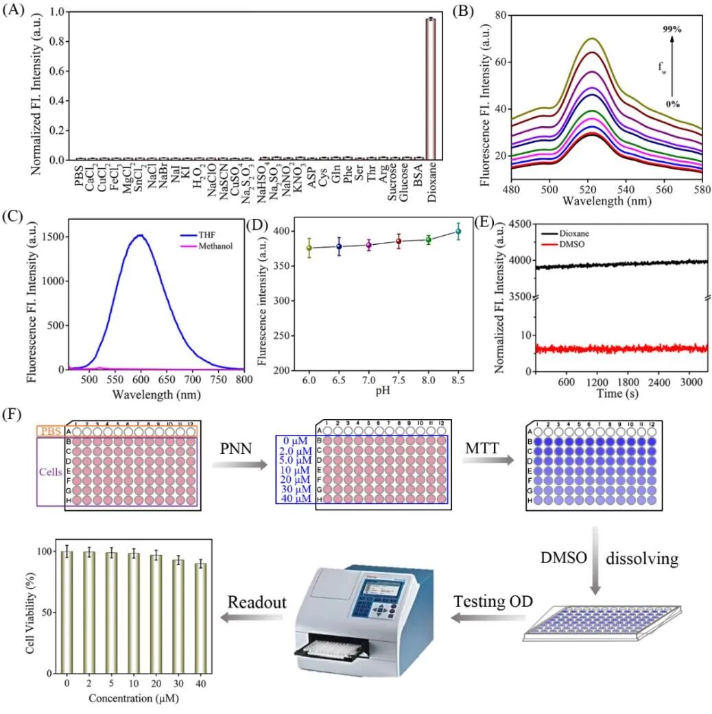 图 3.(A)PNN对各种生物相关物种的选择性。(B)PNN在甲醇-甘油系统中的荧光光谱,其中甘油(fw)的分数从0到99%。(C)PNN在THF和甲醇中的荧光光谱。(D)PNN在不同pH介质中的荧光光谱。(E)PNN在1.4二氧六环和DMSO中的光稳定性。(F)PNN的MTT测试。