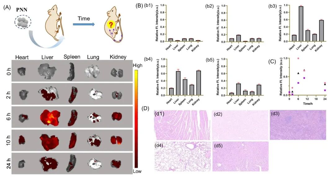 图 6 (A)PNN注射后主要器官的荧光成像。(B)(b1) 0 h, (b2) 2.0 h, (b3) 6.0 h, (b4) 10 h, (b5) 24 h 时心脏、肝脏、脾脏、肺和肾脏中PNN的荧光强度。(C)不同时间点PNN在心脏、肝脏和肾脏中的荧光强度。(D)(d1)心脏、(d2)肝脏、(d3)脾脏、(d4)肺和(d5)肾脏的HE染色结果。以正常肝6.0 h的平均荧光强度作为对照值。