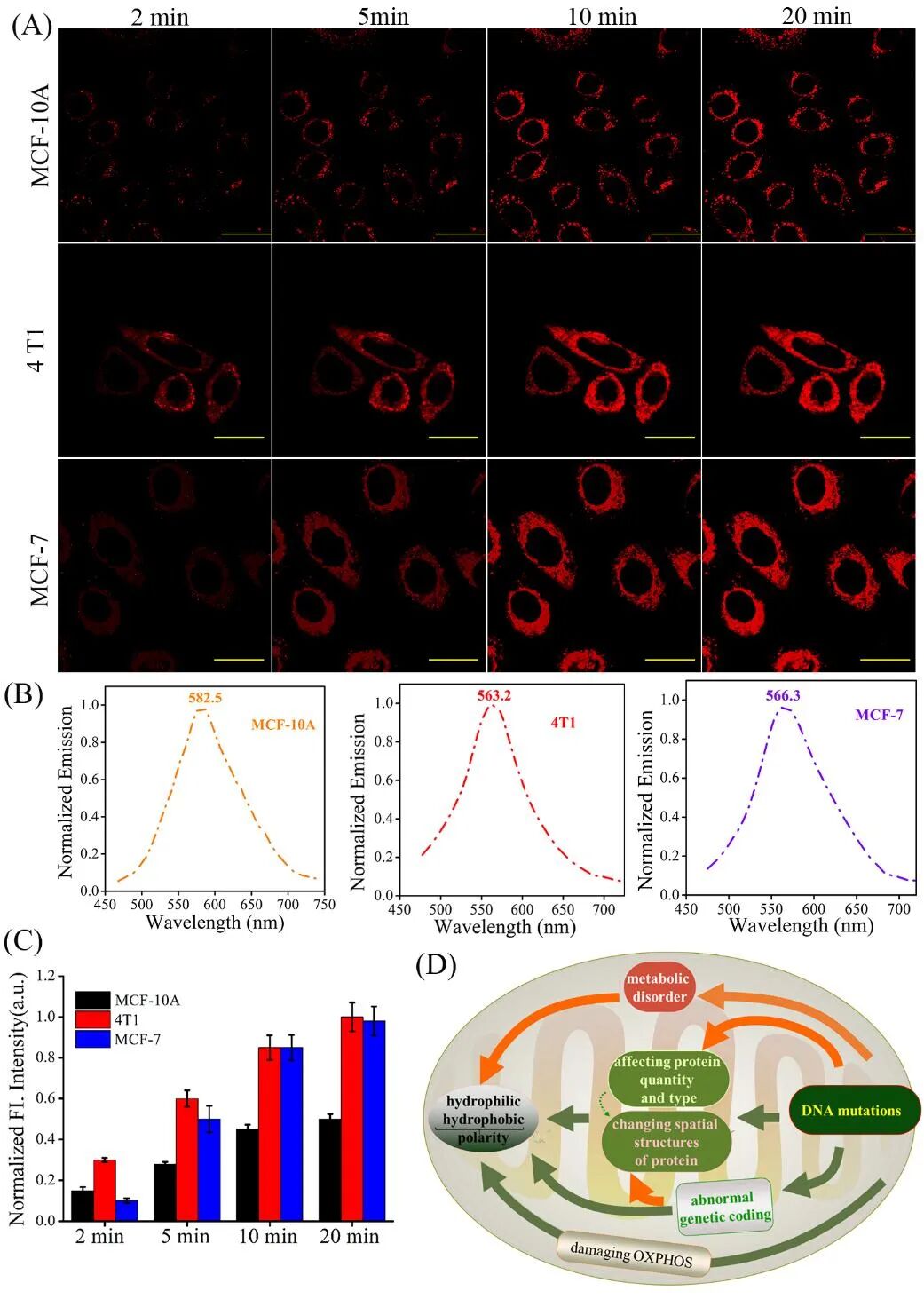 图 5 (A)PNN在正常细胞MCF-10A与癌细胞4T1、MCF-7的荧光图像。(B)PNN在正常细胞MCF-10A和癌细胞4T1、MCF-7内的原位光谱。(C)为(A)的平均荧光强度。(D)提出的乳腺癌细胞线粒体极性变化的机制。(氧化磷酸化缩写为OXPHOS)。