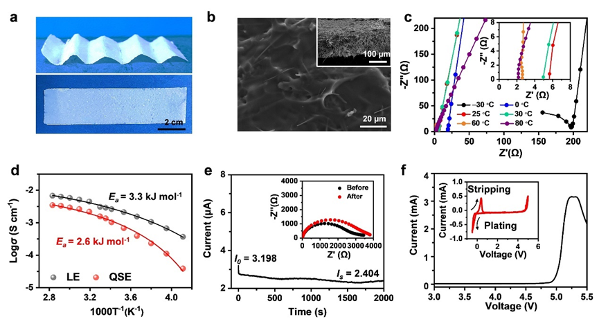 图1. 电解质的物理化学性质:(a) QSE膜的光学照片;(b)QSE膜的表面和截面(插图)SEM图;(c) QSE在-30至80 ℃温度范围内的阻抗谱;(d)QSE和LE的log σ-T-1图(球形)和相应的VTF拟合结果(实线);(e)Na|QSE|Na电池极化曲线,插图:极化前后的阻抗谱;(f) QSE膜的LSV和CV(插图)曲线