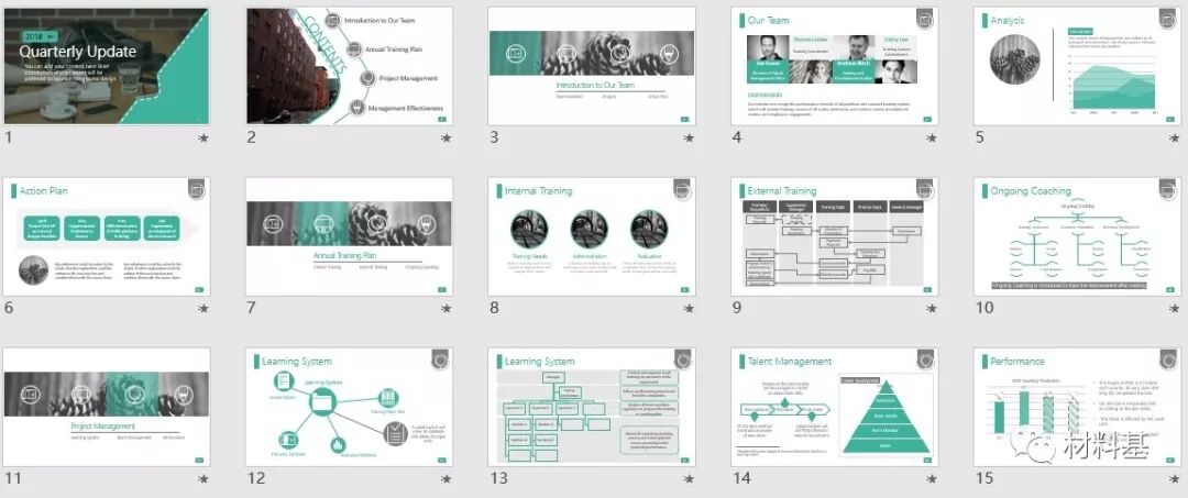 PPT是一张张幻灯片组成,要将这些幻灯片的信息串起来离不开一个好的模板。模板应当做到风格统一,排版齐整。对字体颜色、大小、位置等都有一定要求。为了达到最好的效果,PPT应当图文并茂而非满屏文字。通过直观的内容简洁清晰地展示,便于听众的接受。应粉丝需求,材料基微信公众号小编收集了100余页精美PPT模板分享给大家,希望对大家有所帮助。