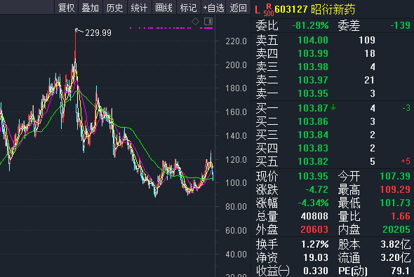 在经历了一个交易日的短暂回暖后,6月22日,昭衍新药盘中又遭抛售,一度跌超6个点,截止收盘报价108.67元/股,414.7亿市值较巅峰695亿元规模缩水40%。