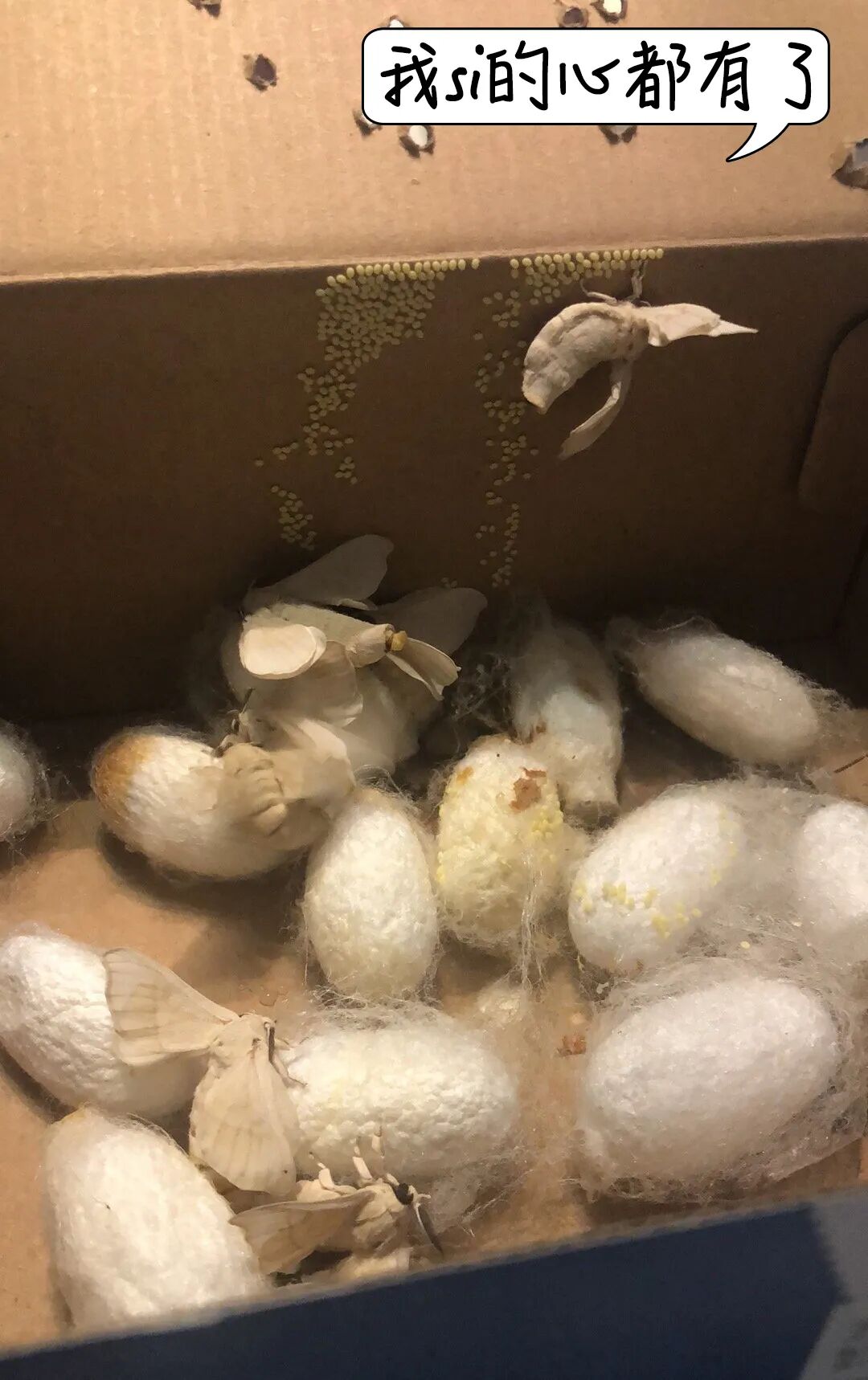 日子一天天过去,终于熬到蚕宝宝破茧了,好家伙!成了硕大巨肥的蛾子不说,还拉了密密麻麻淡黄色的虫卵!!!