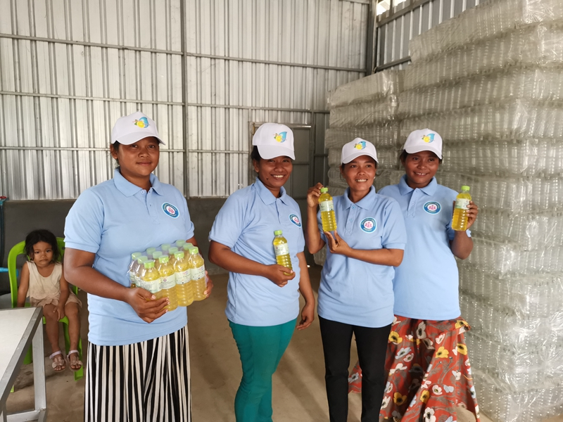 村民在柬埔寨干丹省莫穆坎普县斯瓦安普乡的洗洁精加工厂展示生产的洗洁精,此为中国援建扶贫项目
