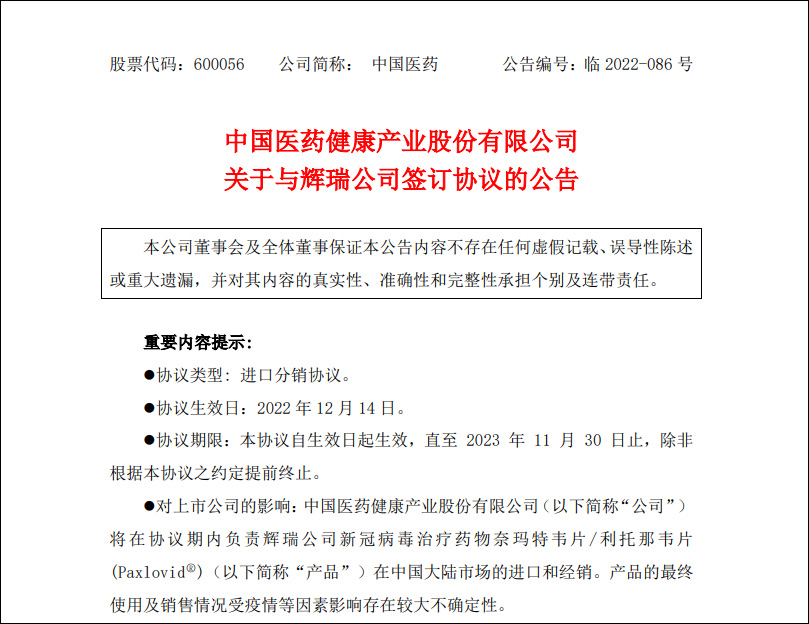 据中国医药公告,12月14日,中国医药健康产业股份有限公司与辉瑞公司签订协议,将在协议期内负责辉瑞公司新冠病毒治疗药物奈玛特韦片/利托那韦片(Paxlovid)在中国大陆市场的进口和经销。