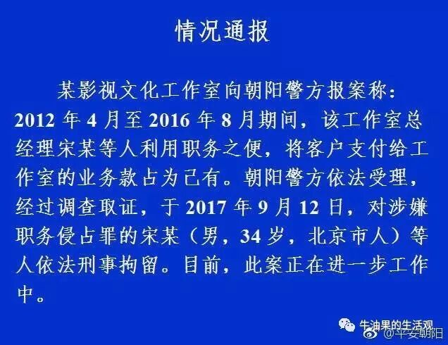 平安朝阳发微博宣布宋喆等人因涉嫌将工作室业务侵占己有,被刑事拘留。点赞最高的留言是:宋喆有难,八方点赞。