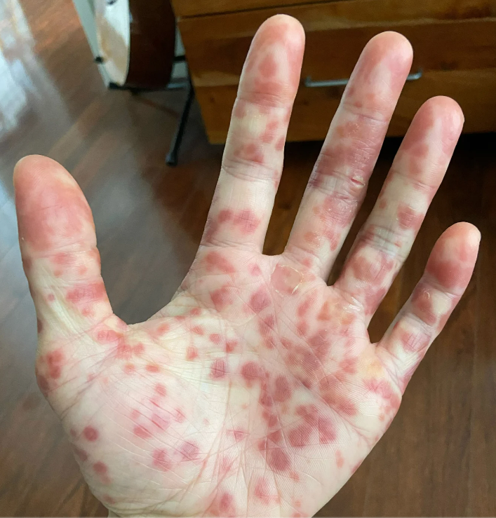 起初,他认为是湿疹,毕竟这些红疹和之前猴痘的外部表现差异太大,完全不一样……然而,在服用抗生素和类固醇后,他的症状不仅没有缓解,反而迅速炸出了更多红疹!