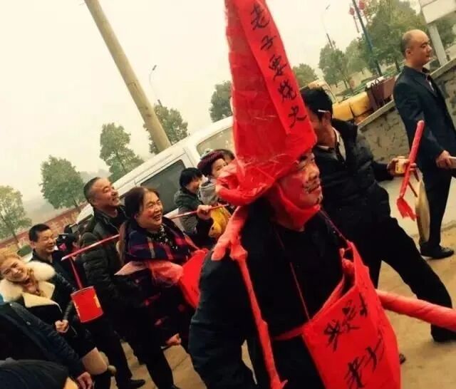 又或者给公公换上新郎的装束,戴着红高帽,扛着钉耙,敲锣打鼓地喊着“公公扒灰了”,暗示公媳乱伦奸情被曝光。