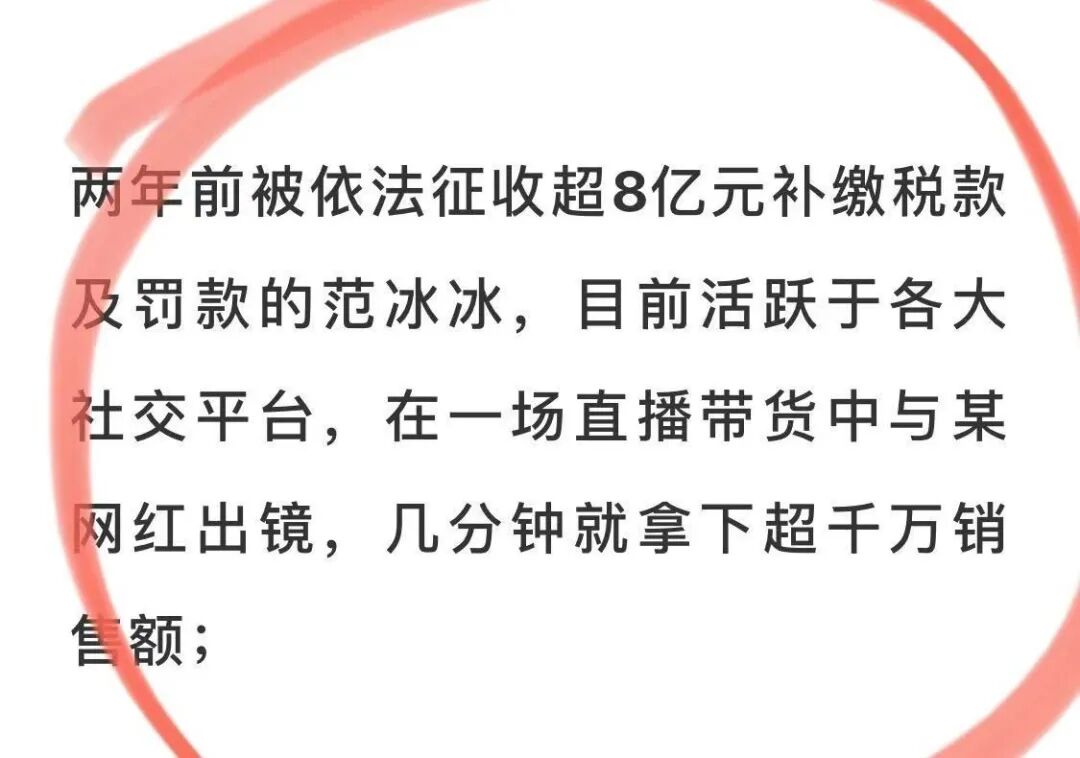 文章更是用黑体加粗,点名了偷税8亿的范冰冰,用词比较严厉,原文是:两年前被依法征收超8亿元补缴税款及罚款的范冰冰,目前活跃于各大社交平台,在一场直播带货中与某网红出镜,几分钟就拿下超千万销售额。