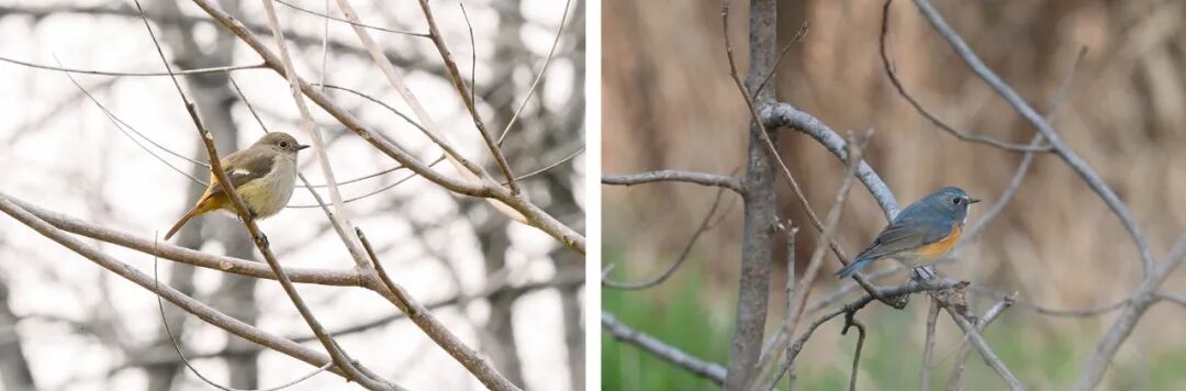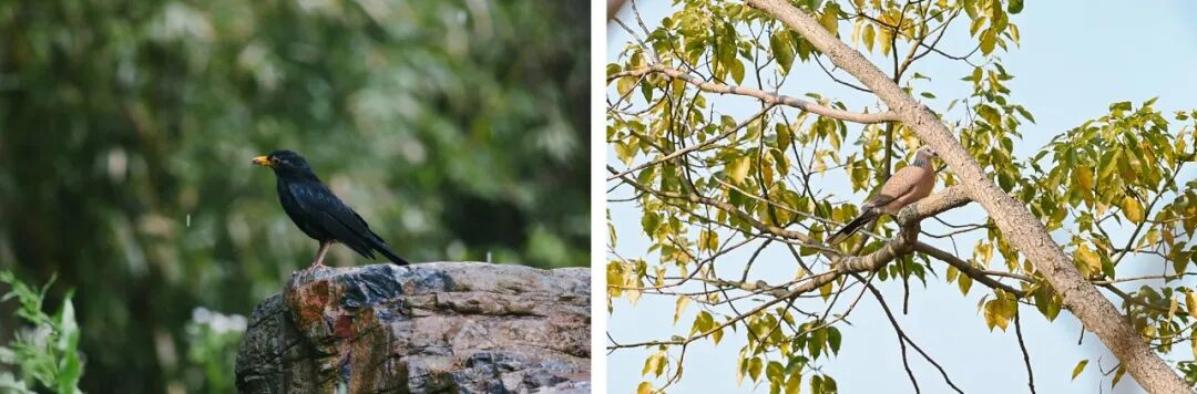 ▲上海常见林鸟系列,分别为北红尾鸲、红胁蓝尾鸲、乌鸫、珠颈斑鸠