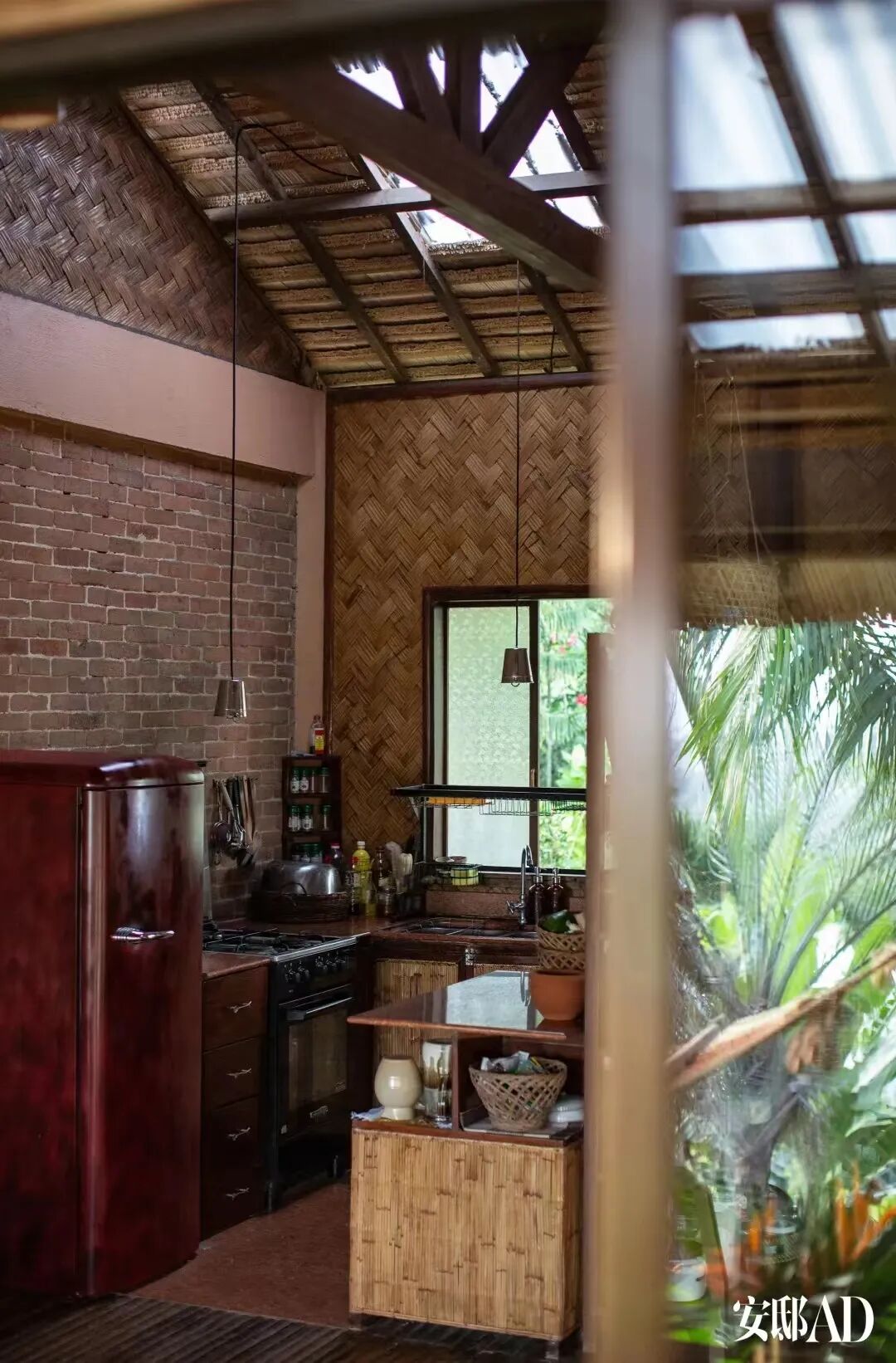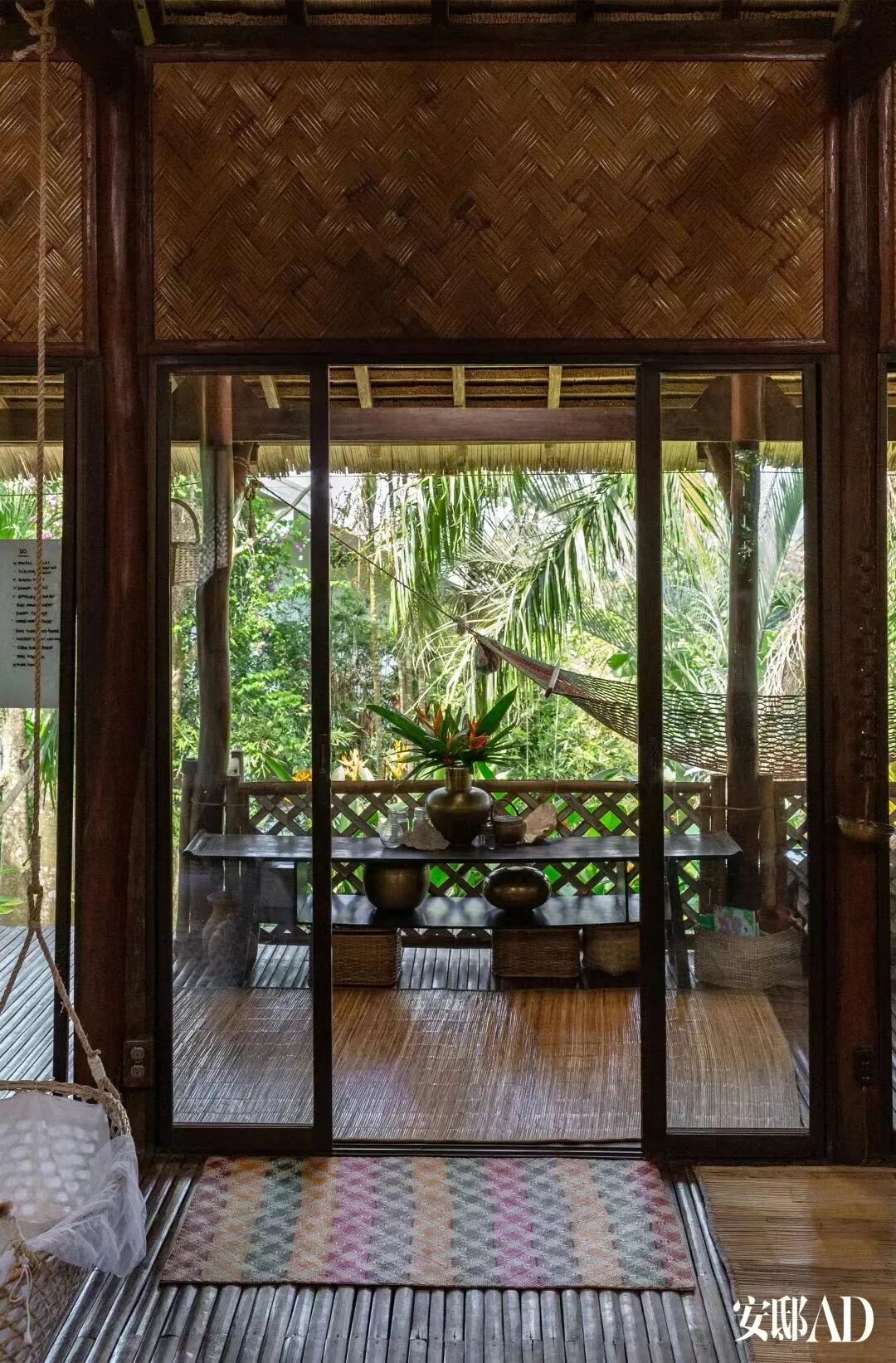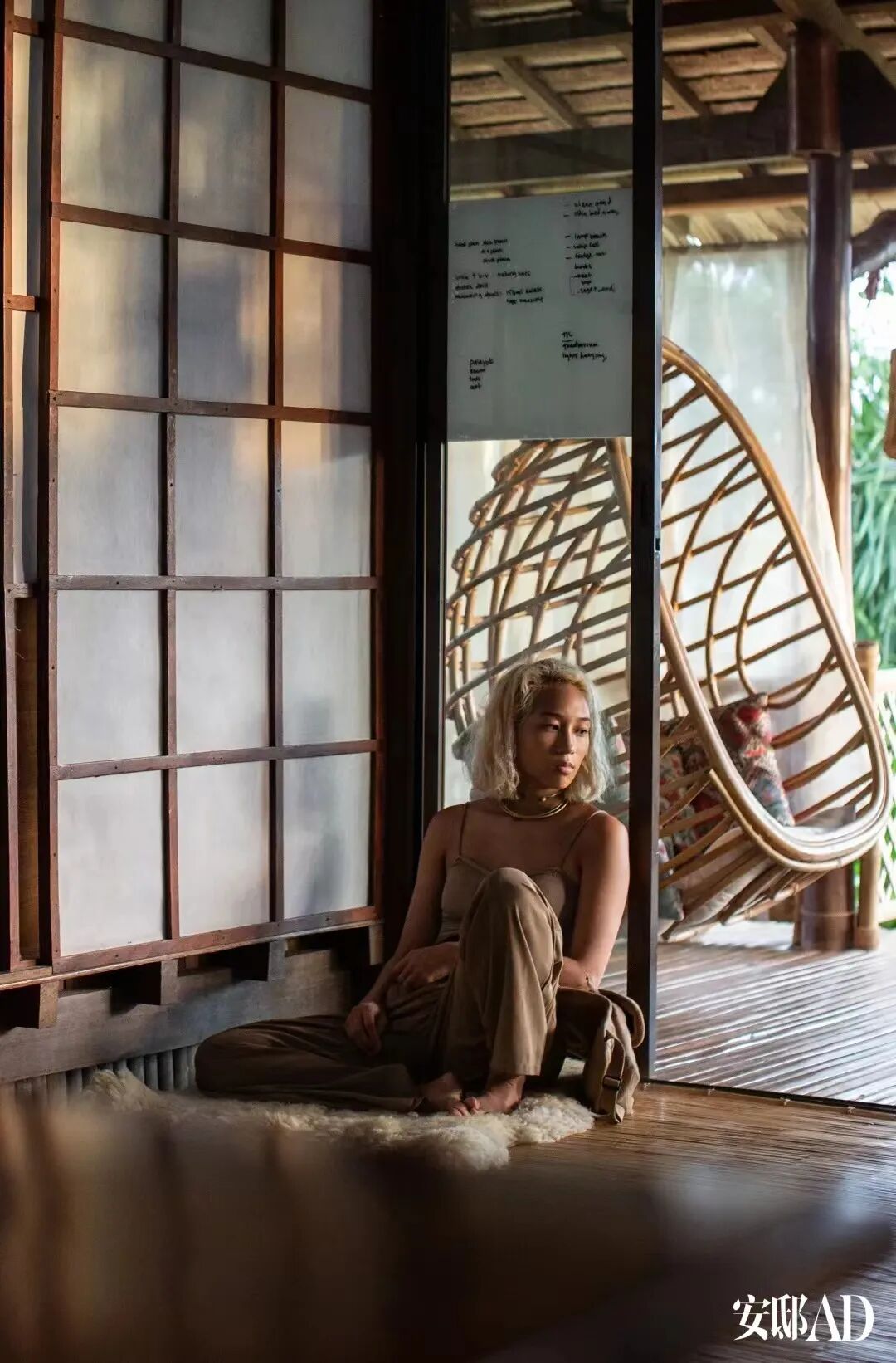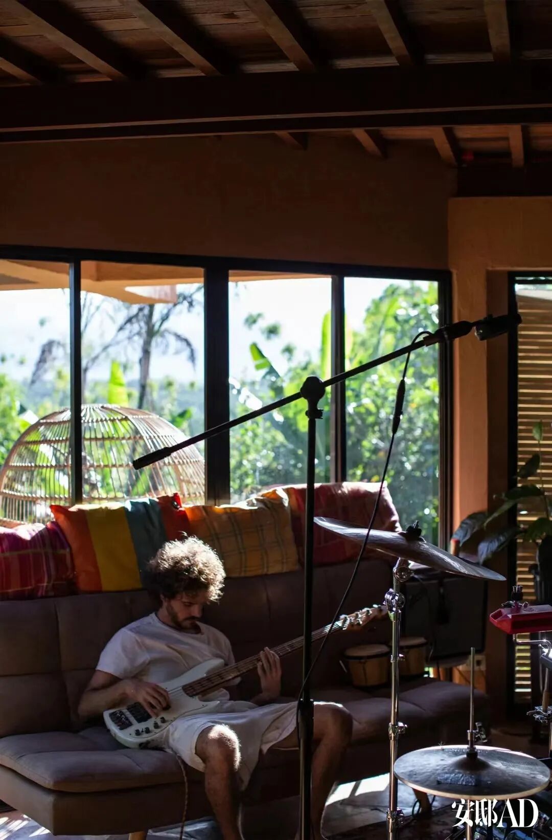 院子里,高大棕榈树、宽大的芭蕉叶,伴着清晨的阳光,影影绰绰,落在玻璃窗上;FKJ坐在钢琴旁,蓬松的卷发,慵懒的背影,指尖流淌出动人的音符~FKJ是法国House新一代先锋音乐人,这场演出是他在菲律宾自家房子里完成的。看这场演出时,芍药就他的家产生了极大的好奇心,视频中流出的诗意片段,令人产生无限向往。FKJ和妻子(((O)))、孩子一起生活在菲律宾一座名叫YlangYlang/依兰依兰的小岛上。他们的房子隐匿在一片茂密的棕榈树群中,据说是由一位奥地利退休舞者设计,为菲律宾传统建筑Bahay Kubo高跷竹屋与偏现代建筑的复合式空间。竹屋三面环绕着密林,一面朝海,茂密的棕榈树将房子掩映成一座绿岛,西太平洋炙热的海风从这里穿堂而过,耳边是自由欢腾的虫鸣鸟叫,风和海水合奏出浪漫的乐曲~FKJ和妻子(((O)))在这里几乎过着原始的诗意生活,日出而作,日落而息,房子没有通电,日常用电靠的是太阳能。最初,他们是在Airbnb上发现的这个房子,住了一晚后,房子的构造让他们十分着迷。没想到房东说正准备把它卖掉,而他们当时恰好也在找新的住所,于是就买了下来,按照自己的喜好,改造成梦想之家。(((O)))将这座小屋称为「The Sundrop Garden」~整栋房子分为两部分,高跷竹屋是一家人的居住空间,另一边,偏现代化的建筑是夫妻二人的音乐工作室。高跷竹屋以竹木为主要材料,下方架空,使得空气流通,防潮防暑防蛇虫,与我国西南地区的竹楼功能类似。整间屋子,地板、天花板、梁柱用到的都是竹子或木头材质, 他们还在屋顶开了一个天窗,可以让自然光很好的照进屋子,拥有绝美的光影。室内的软装,也多采用自然材质,如竹木、藤编、传统编织品。客厅中,木质长椅作沙发,木桩作茶几,长椅放上软垫,铺一条具有传统特色的毯子,别有一番风情。沙发后方的墙上挂着一幅水墨画,这是2018年FKJ来北京演出时,一位粉丝送的。客厅两侧的门采用的是落地玻璃门,可以保持开放通透,与室外的茂密丛林几乎0距离。客厅外还有一个阳台,廊下挂着藤编的摇椅和吊床,一家人黄昏的休闲时光,常常在这里度过。厨房小巧精致,位于天窗下,开放式设计,厨房的台面橱柜,也用的是竹、木材质。FKJ的卧室看起来很像民宿,獐子门、百叶窗打造柔和的光线,配上棉麻床品,竹制的家具,打造出一种舒适的度假氛围感。卧室另一侧的卫生间,与卧室风格保持一致,竹编家具占满了空间,就连镜子的边框也是竹,墙上还挂着印有「中国长城」的竹编斗笠帽。比起明亮、舒适的居住空间,工作室像一个神秘的盒子,更吸引我。工作室的家具、软装十分随意,乐器、唱片充斥着整个空间,透着一种慵懒、自由。四面是大大的玻璃窗、竹制的百叶窗,将光与植物糅合得恰到好处。架子鼓、钢琴、电子琴、音箱……各自随意的散落着,好像它们原本就是从这里生长出来的,肆意舒展。FKJ近两年的歌曲都是在这间工作室里创作出来的,无数个清晨,伴着阳光和晨雾,鸟鸣与海浪,FKJ坐在这里,敲下一个个音符~都说家如其人,FKJ的家与其灵魂的契合度极高。看完他的家,你或许能够明白,为什么他可以创作出如此浪漫的乐曲~但话说回来,FKJ会从法国搬去菲律宾的小岛居住,并非是为了创作,而是因为爱情。02