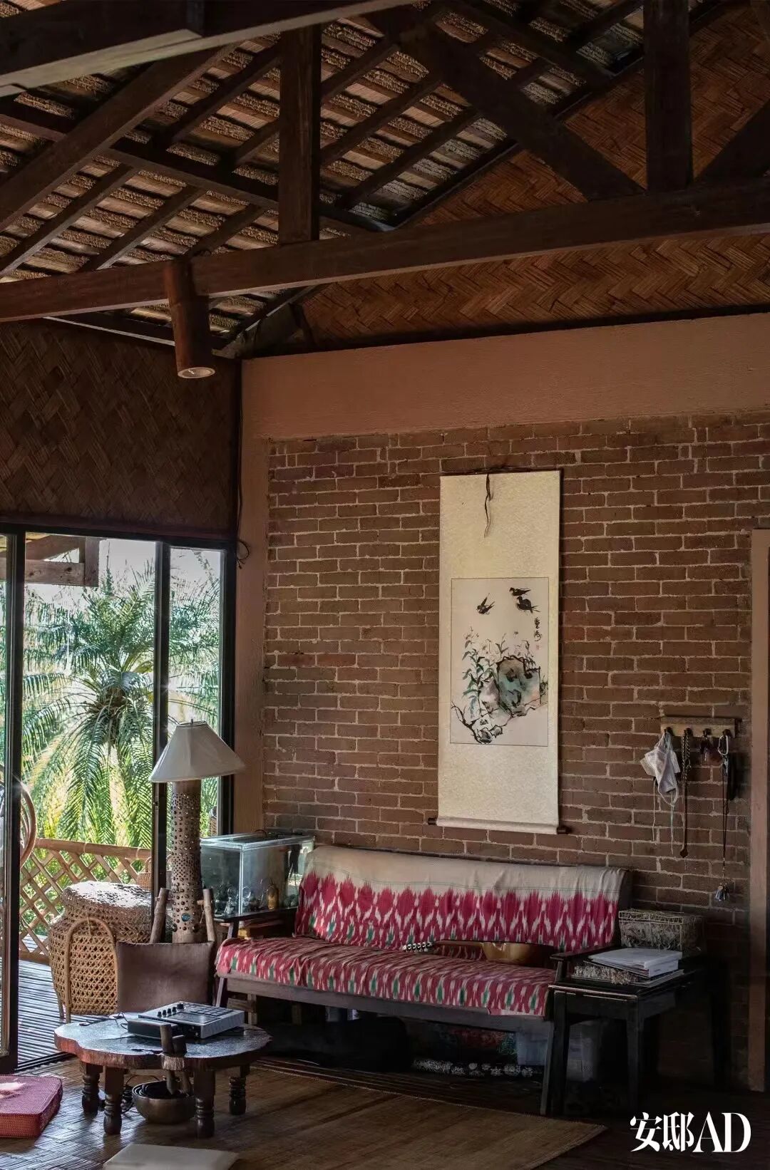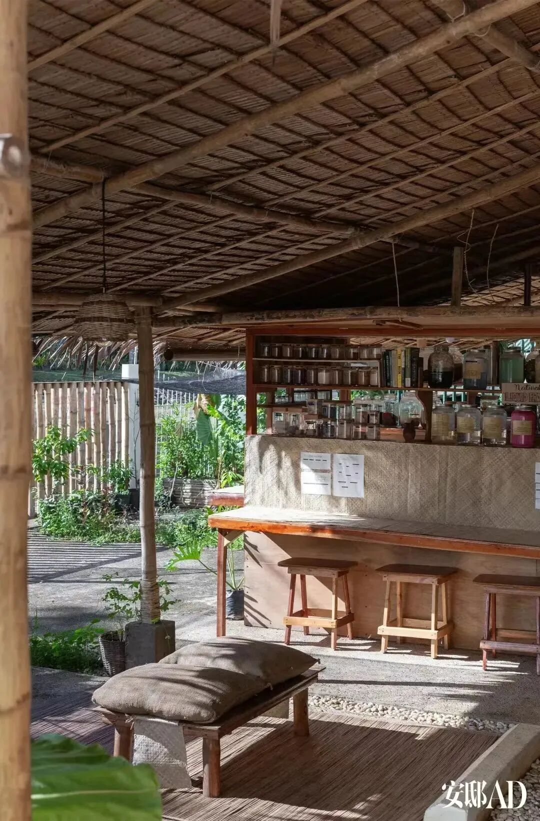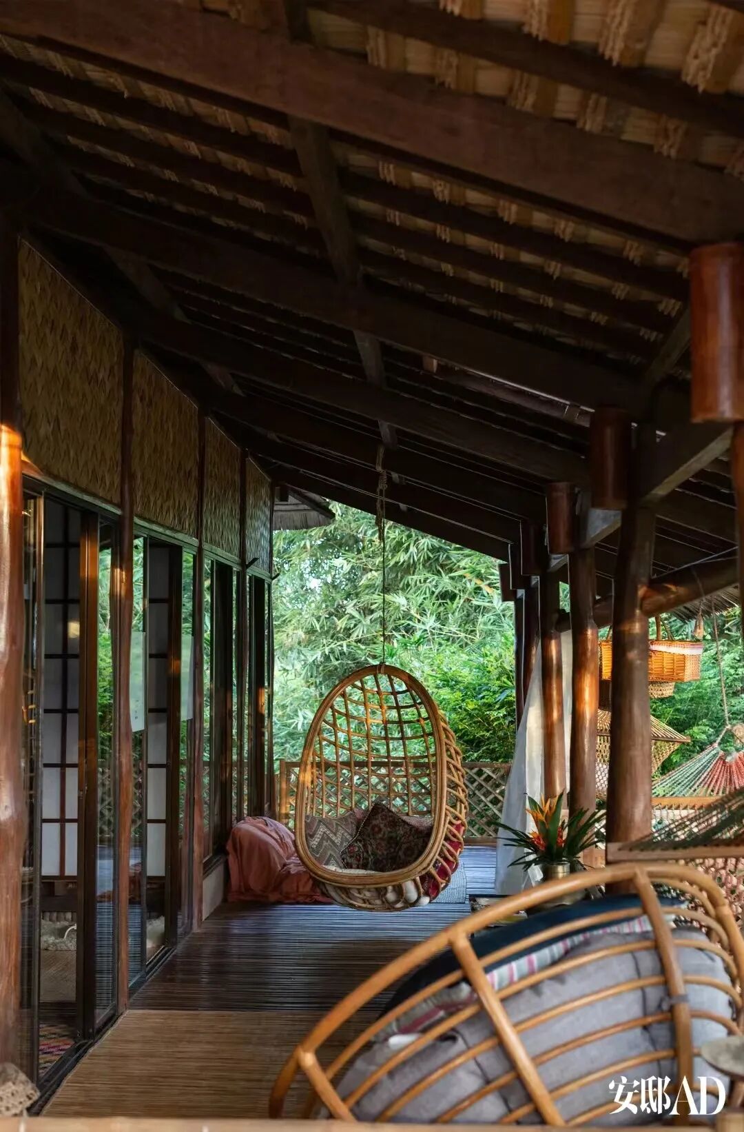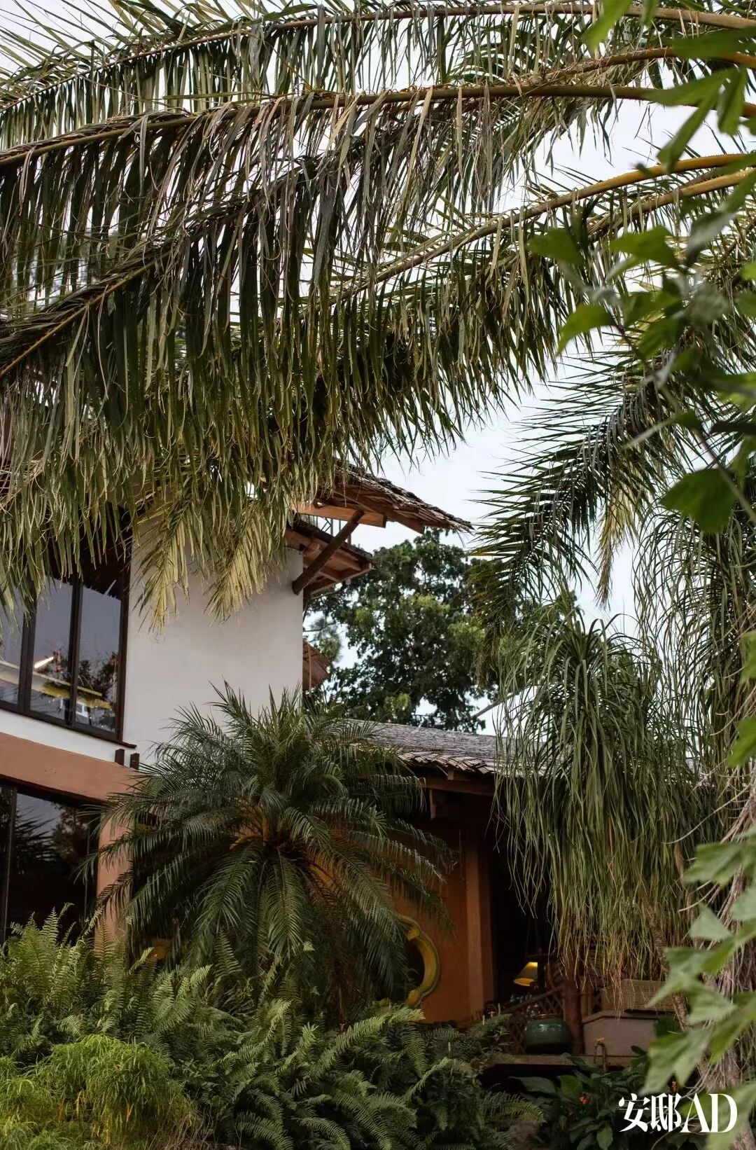 院子里,高大棕榈树、宽大的芭蕉叶,伴着清晨的阳光,影影绰绰,落在玻璃窗上;FKJ坐在钢琴旁,蓬松的卷发,慵懒的背影,指尖流淌出动人的音符~FKJ是法国House新一代先锋音乐人,这场演出是他在菲律宾自家房子里完成的。看这场演出时,芍药就他的家产生了极大的好奇心,视频中流出的诗意片段,令人产生无限向往。FKJ和妻子(((O)))、孩子一起生活在菲律宾一座名叫YlangYlang/依兰依兰的小岛上。他们的房子隐匿在一片茂密的棕榈树群中,据说是由一位奥地利退休舞者设计,为菲律宾传统建筑Bahay Kubo高跷竹屋与偏现代建筑的复合式空间。竹屋三面环绕着密林,一面朝海,茂密的棕榈树将房子掩映成一座绿岛,西太平洋炙热的海风从这里穿堂而过,耳边是自由欢腾的虫鸣鸟叫,风和海水合奏出浪漫的乐曲~FKJ和妻子(((O)))在这里几乎过着原始的诗意生活,日出而作,日落而息,房子没有通电,日常用电靠的是太阳能。最初,他们是在Airbnb上发现的这个房子,住了一晚后,房子的构造让他们十分着迷。没想到房东说正准备把它卖掉,而他们当时恰好也在找新的住所,于是就买了下来,按照自己的喜好,改造成梦想之家。(((O)))将这座小屋称为「The Sundrop Garden」~整栋房子分为两部分,高跷竹屋是一家人的居住空间,另一边,偏现代化的建筑是夫妻二人的音乐工作室。高跷竹屋以竹木为主要材料,下方架空,使得空气流通,防潮防暑防蛇虫,与我国西南地区的竹楼功能类似。整间屋子,地板、天花板、梁柱用到的都是竹子或木头材质, 他们还在屋顶开了一个天窗,可以让自然光很好的照进屋子,拥有绝美的光影。室内的软装,也多采用自然材质,如竹木、藤编、传统编织品。客厅中,木质长椅作沙发,木桩作茶几,长椅放上软垫,铺一条具有传统特色的毯子,别有一番风情。沙发后方的墙上挂着一幅水墨画,这是2018年FKJ来北京演出时,一位粉丝送的。客厅两侧的门采用的是落地玻璃门,可以保持开放通透,与室外的茂密丛林几乎0距离。客厅外还有一个阳台,廊下挂着藤编的摇椅和吊床,一家人黄昏的休闲时光,常常在这里度过。厨房小巧精致,位于天窗下,开放式设计,厨房的台面橱柜,也用的是竹、木材质。FKJ的卧室看起来很像民宿,獐子门、百叶窗打造柔和的光线,配上棉麻床品,竹制的家具,打造出一种舒适的度假氛围感。卧室另一侧的卫生间,与卧室风格保持一致,竹编家具占满了空间,就连镜子的边框也是竹,墙上还挂着印有「中国长城」的竹编斗笠帽。比起明亮、舒适的居住空间,工作室像一个神秘的盒子,更吸引我。工作室的家具、软装十分随意,乐器、唱片充斥着整个空间,透着一种慵懒、自由。四面是大大的玻璃窗、竹制的百叶窗,将光与植物糅合得恰到好处。架子鼓、钢琴、电子琴、音箱……各自随意的散落着,好像它们原本就是从这里生长出来的,肆意舒展。FKJ近两年的歌曲都是在这间工作室里创作出来的,无数个清晨,伴着阳光和晨雾,鸟鸣与海浪,FKJ坐在这里,敲下一个个音符~都说家如其人,FKJ的家与其灵魂的契合度极高。看完他的家,你或许能够明白,为什么他可以创作出如此浪漫的乐曲~但话说回来,FKJ会从法国搬去菲律宾的小岛居住,并非是为了创作,而是因为爱情。02