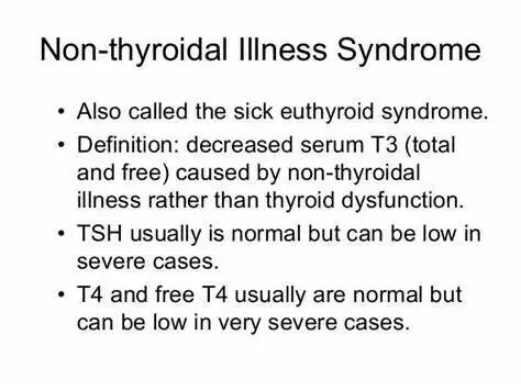 严重的躯体疾病以及由急性或慢性压力引起的疾病,尤其是住院患者,都会出现 NTIS(Pappa,2011)。NTIS 表现为 tT3 和/或 fT3 水平低下的甲状腺激素异常(Pappa,2011)。NTIS 患者在饥饿或长时间禁食期间可能出现 fT4 水平升高,这会诱导脂肪酸释放,抑制蛋白质结合(Lim,1993)。
