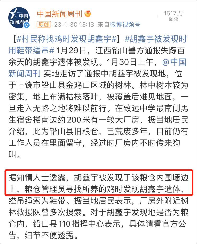 现在根据胡鑫宇母亲的描述,他是在国家储备粮库被发现的,其他家属称,发现遗体的附近他们反复找过不止一两次,但仓库里面没有进去过。