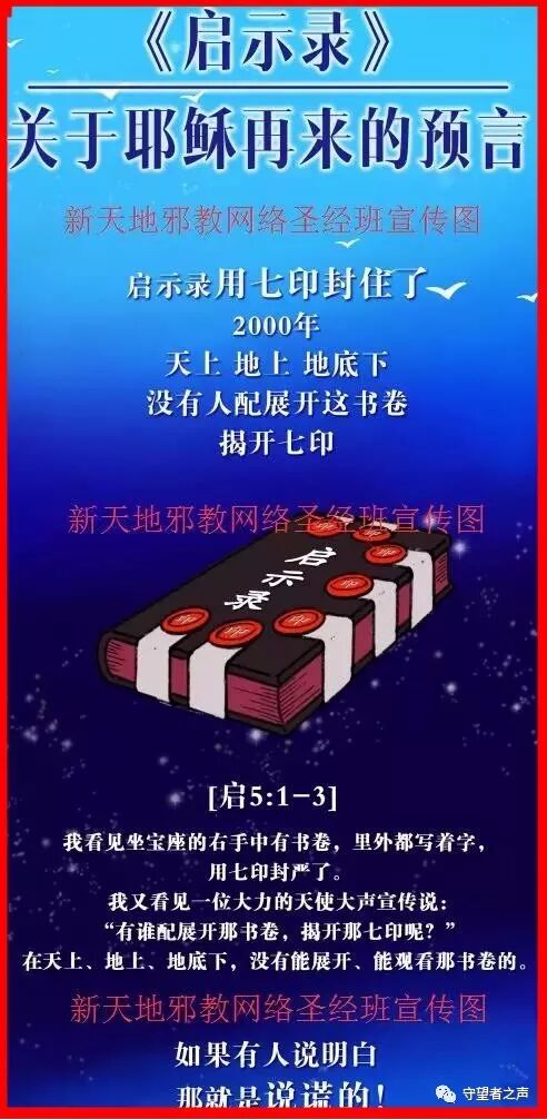 新天地教导说他们的话语来自天上直接的启示,说只有他们才能揭开七印,说在其他地方都不能得救。并叫人通过图片的二维码指引人去学习他们的网络圣经班,目前此图在各大群中传播已久,很多基督徒已经被骗上钩!