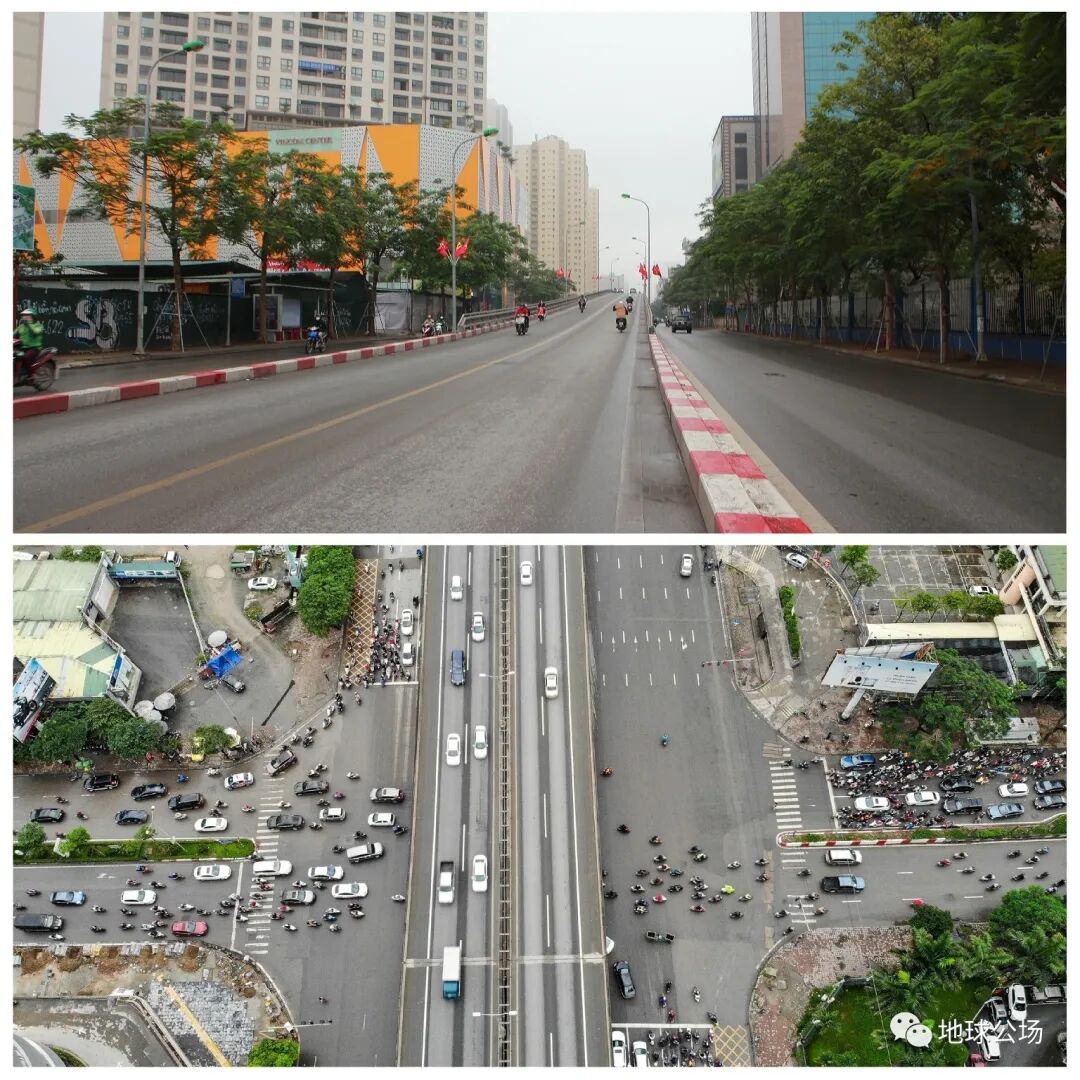 图(上)为疫情刚爆发时,河内黄明监路;图(下)为社会隔离期结束后在河内的一个十字路口。图源:dantri.com.vn