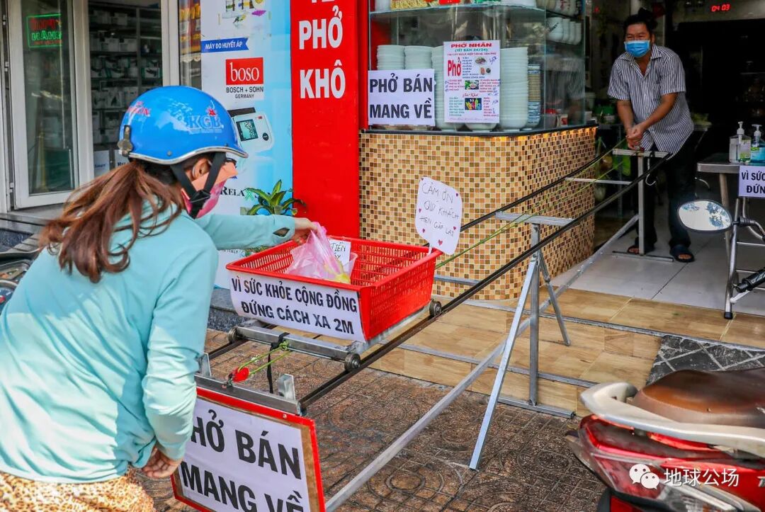 越南社会隔离期间,一家河粉店用动滑轮递送给客人东西。图源:VnExpress