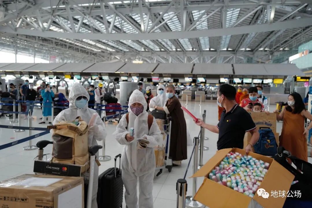 疫情期间的越南机场,很多越南公民从中国、泰国、马来西亚等地飞回越南。机场人员现场发放防护设备。 图源:baoquocte.vn
