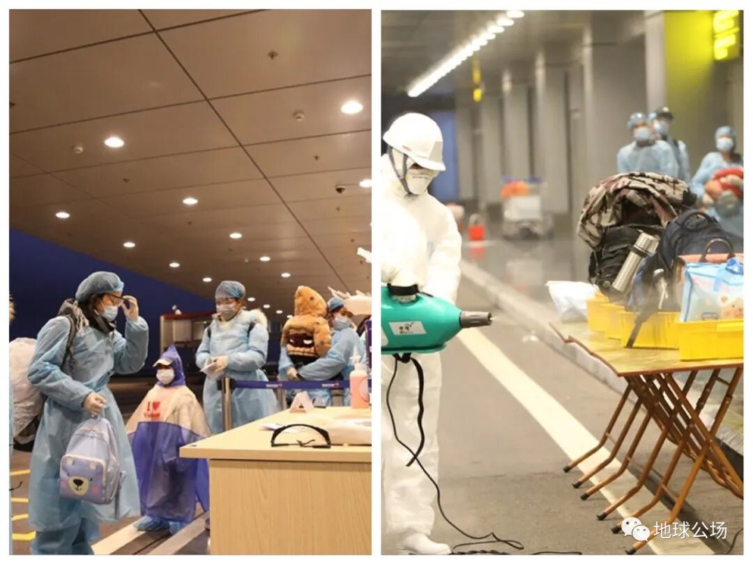 30名越南公民顺利从中国武汉飞抵越南。图(左)为越南公民在机场办理入境手续,图(右)为机场人员对行李喷洒消毒液。图源:越通社