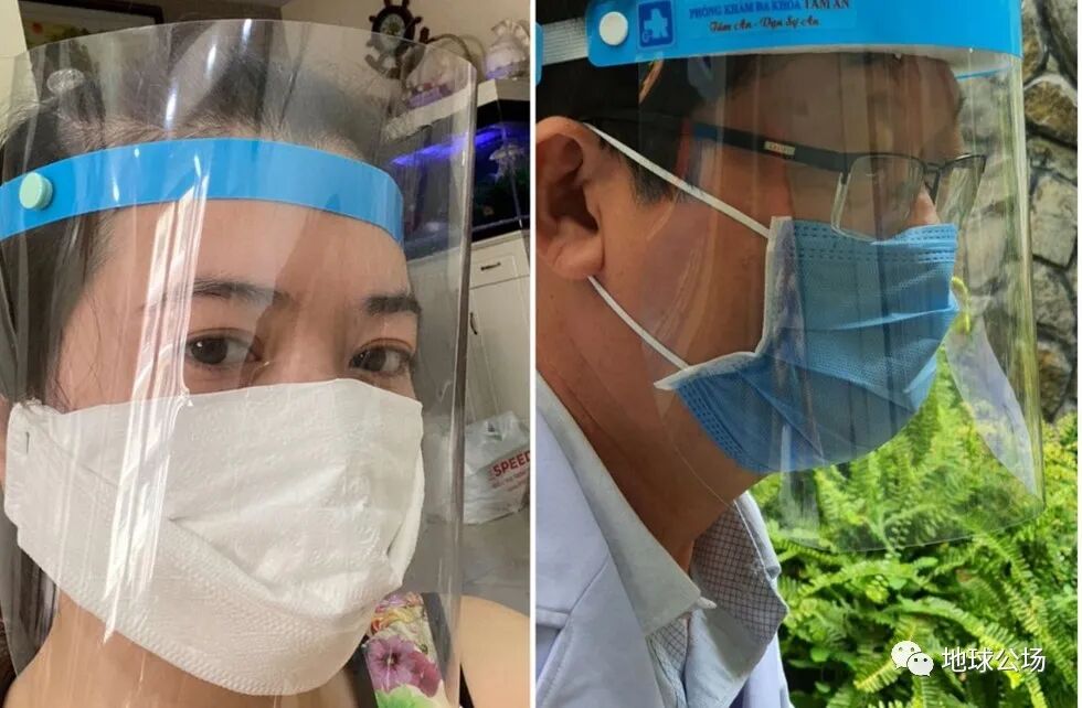 越南人出行有时会用防口水透明罩和雨衣代替防护服。图源:thanhnien.vn