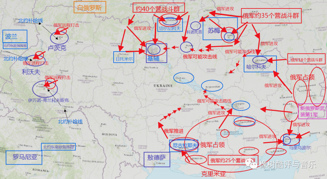 橡树绘制截止3月15日,俄乌战争大致态势图。本文后续将详解本图。