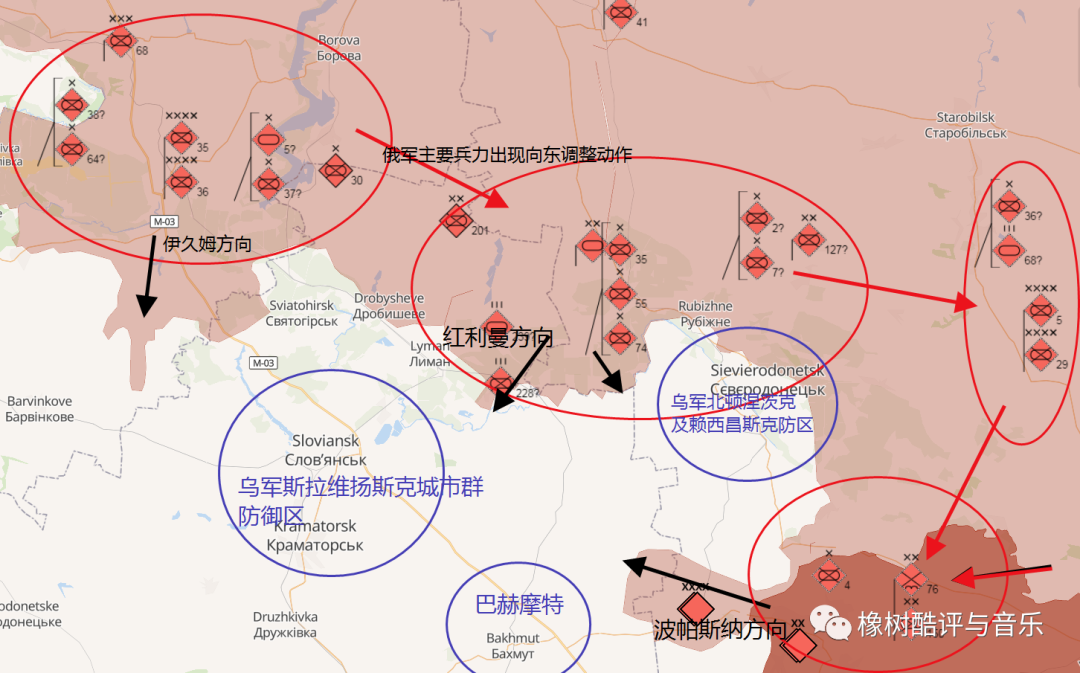 (图2-1)6月4日,伊久姆及顿巴斯北线战场态势。红圈为俄军伊久姆主力作战区域,篮圈为乌军主要防区。红色箭头为俄军主要攻击方向。