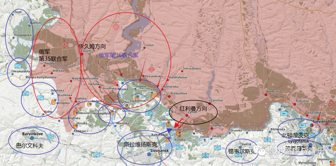 参考上图,其中,俄军第36联合军为左翼,与红利曼方向俄军对斯拉维扬斯克形成钳形攻势。
