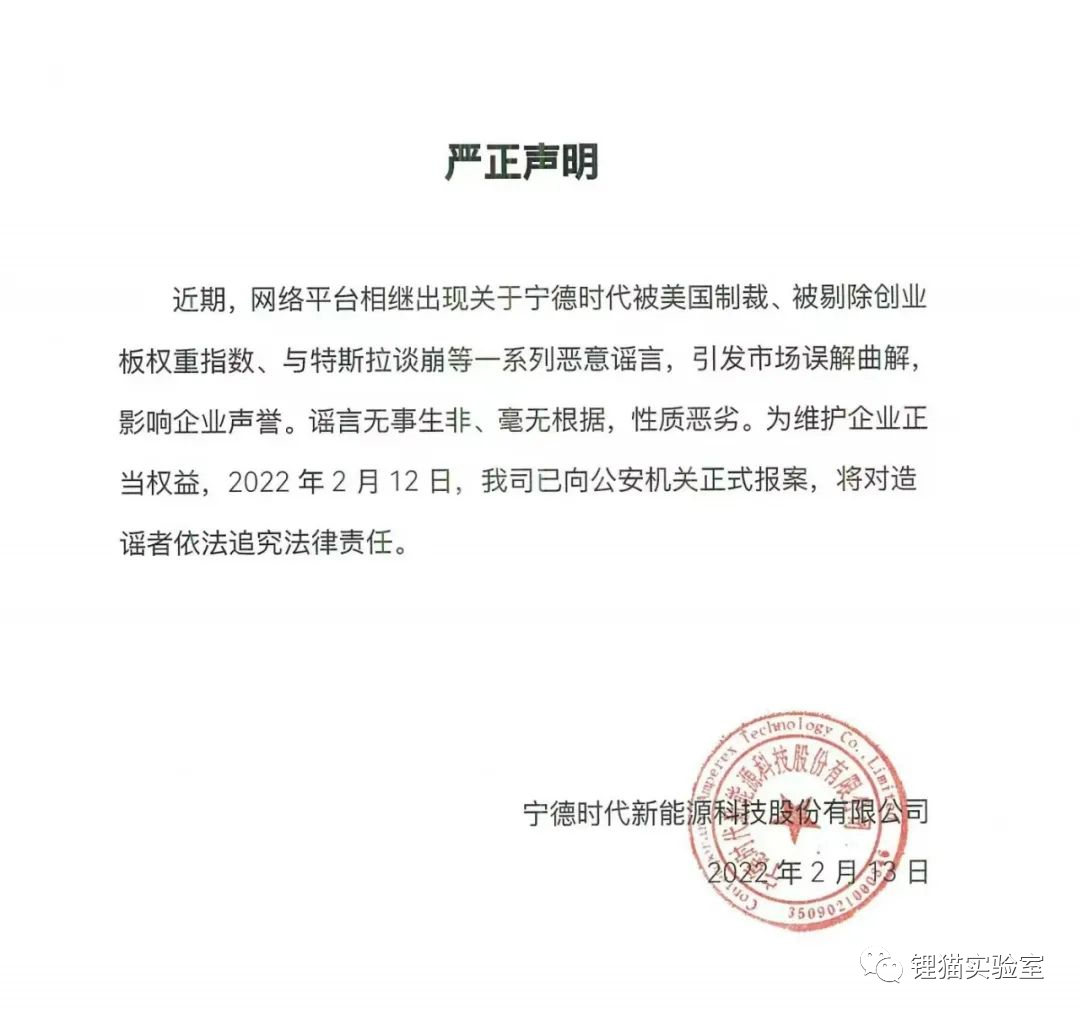 2月13日,宁德时代试图终结这一历时弥久的负面疑云。当天,宁德时代公众号发布了一则“严正声明”,指出近期主要的三个传言均为恶意谣言,且公司已于前一日报案。