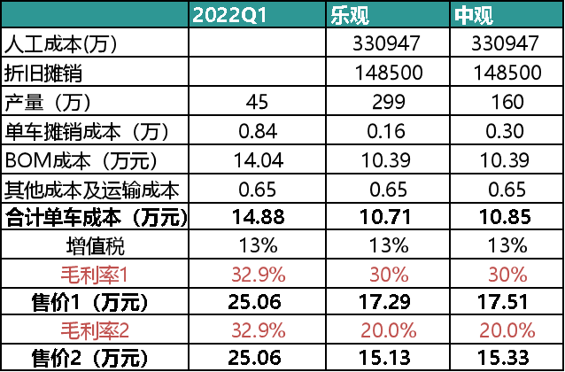 (2)中国员工人数增长20%,也就是18000计算,其他制造和运输成本不变的情况下,(3)中国工厂产能在交付量中占比50%左右(国内产量分别为299万辆与160万辆)的情形计算:
