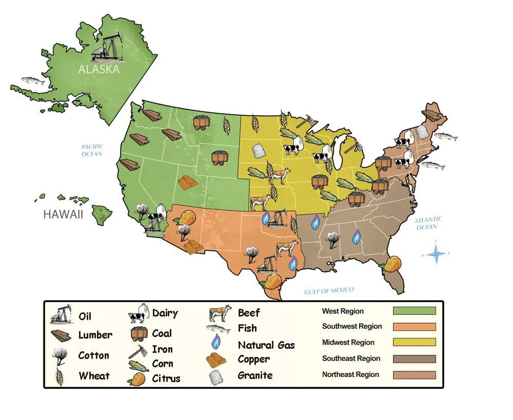 阿巴拉契亚山里埋着煤矿,五大湖附近有铁矿,墨西哥湾还埋着石油,西部山地还有有色金属全家桶。